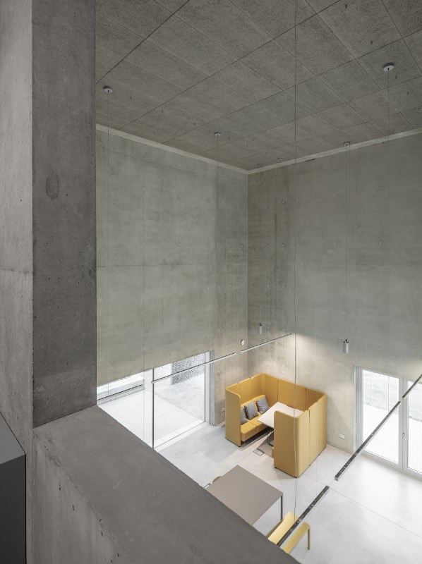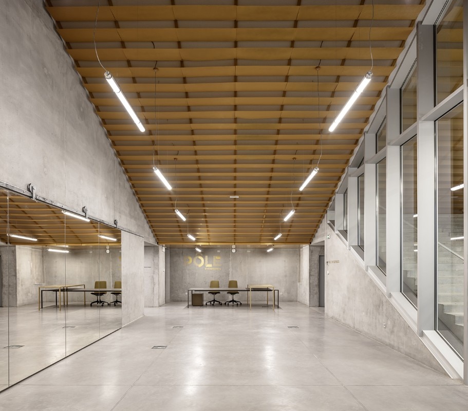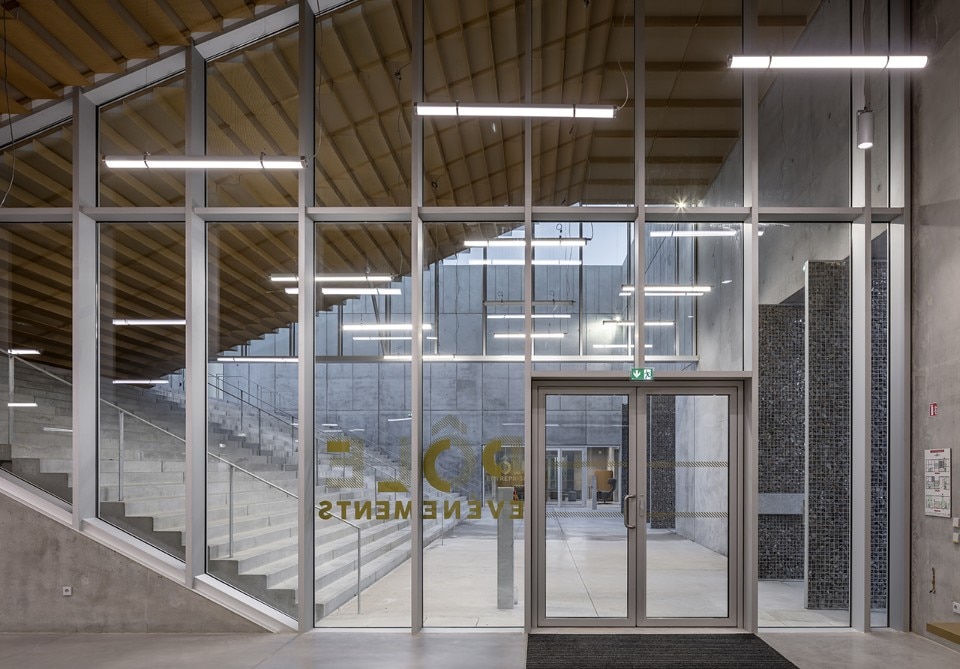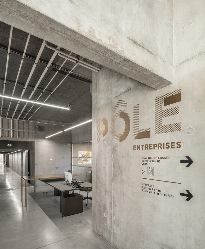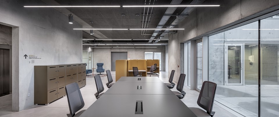 The building is therefore deliberately compact and introverted, with the aim of densifying the uses of the building and making relationships multiply. The business incubator houses three main functions: two large programming centres, an event space and collaborative workspaces. Three shared patios facilitate a fluid interior distribution and serve as an outdoor extension of the spaces.