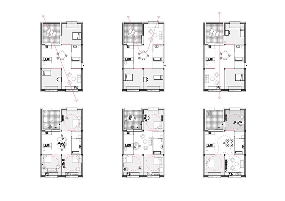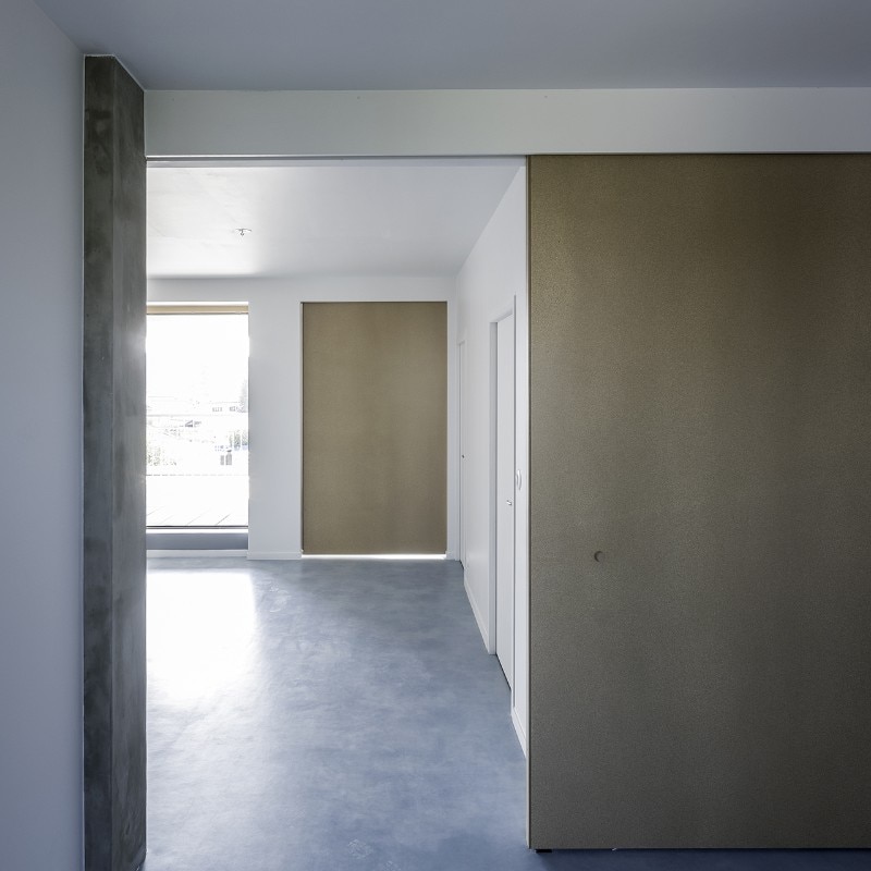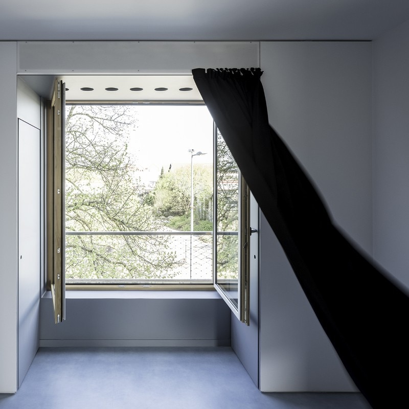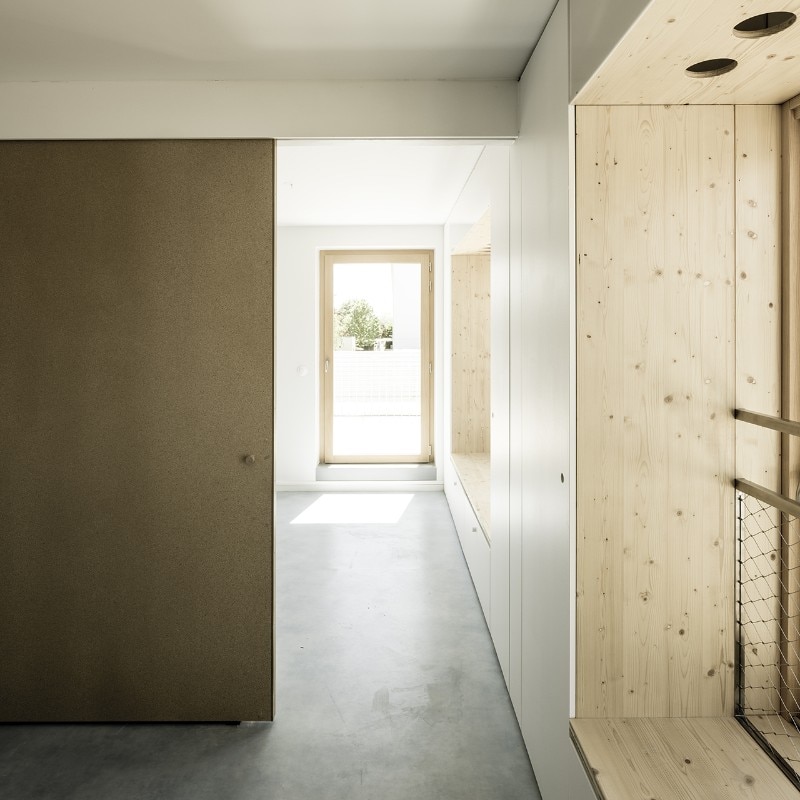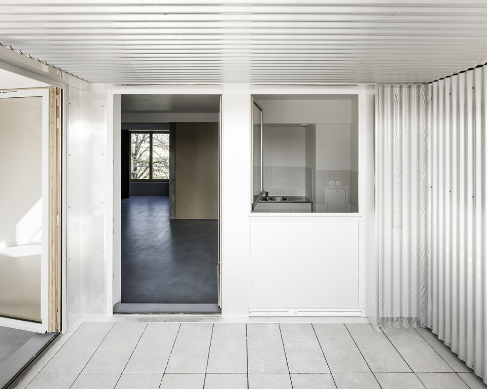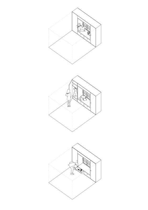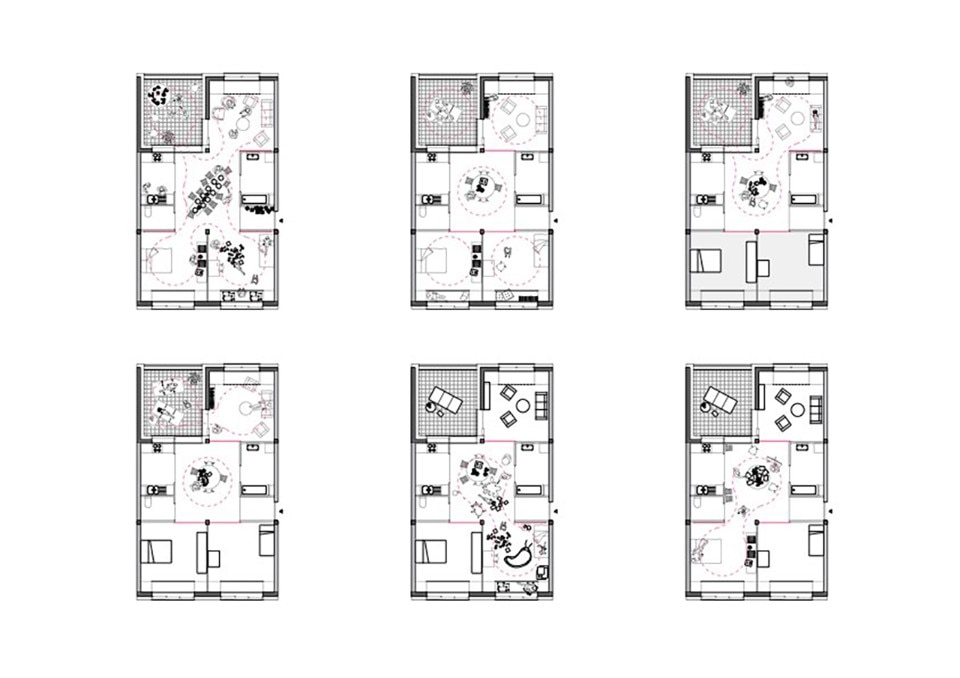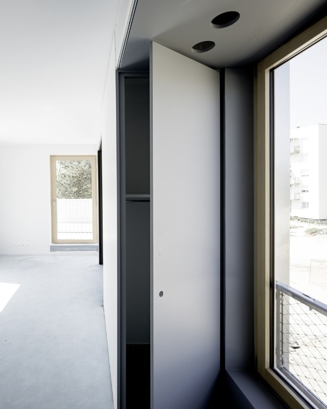 Windows are approximately the same size on all elevations; passages between rooms are oversized; sliding panels are preferred over conventional doors; electrical outlets are evenly spread over all the rooms. These and other solutions emphasize the universal character of these modules, whose function will be defined by their final users.