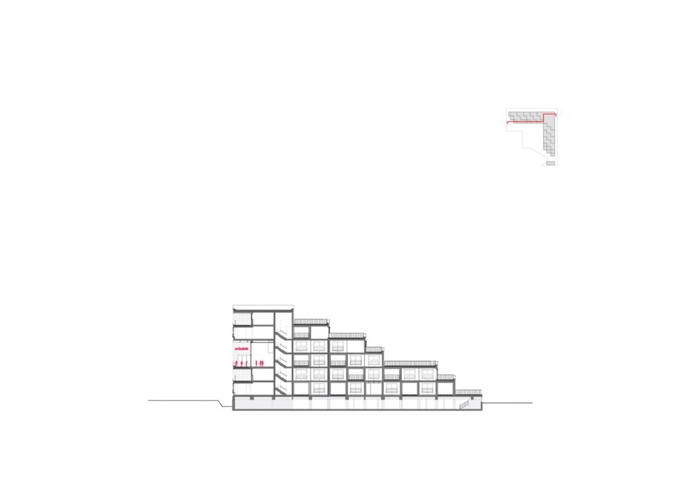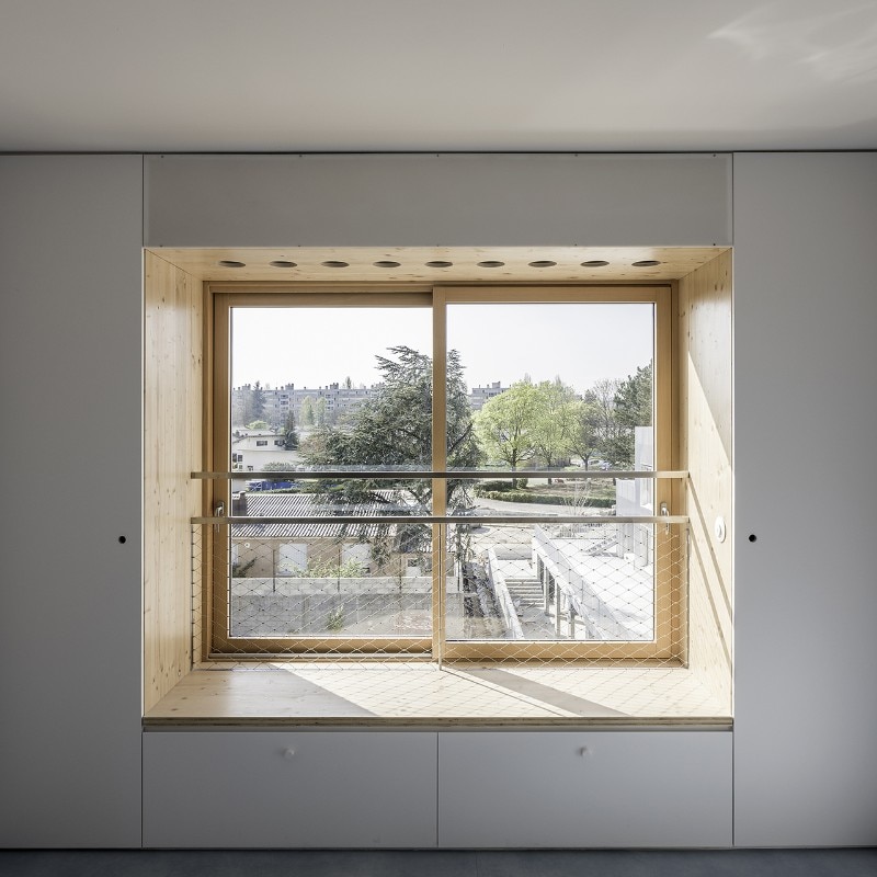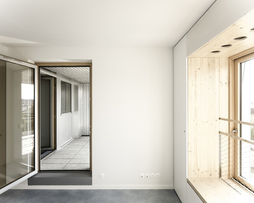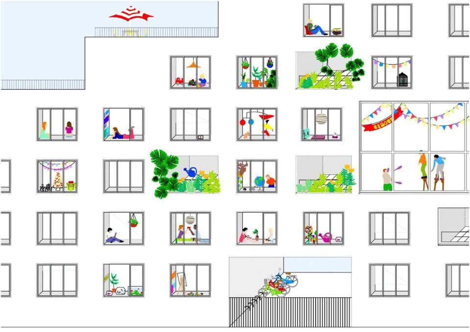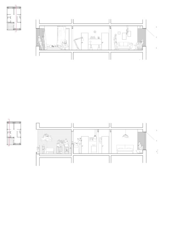 Façades are always three-dimensional and “inhabited”. Delhay highlights how storage areas framing the windows have two functions: on the one side, they allow to leave the interiors unobstructed by too many pieces of furniture; on the other side, they dissuade from covering glazed surfaces with objects of various kinds. This is an interesting strategy to suggest dwellers a virtuous use of their building, which would respect one of its main qualities, to their full advantage.