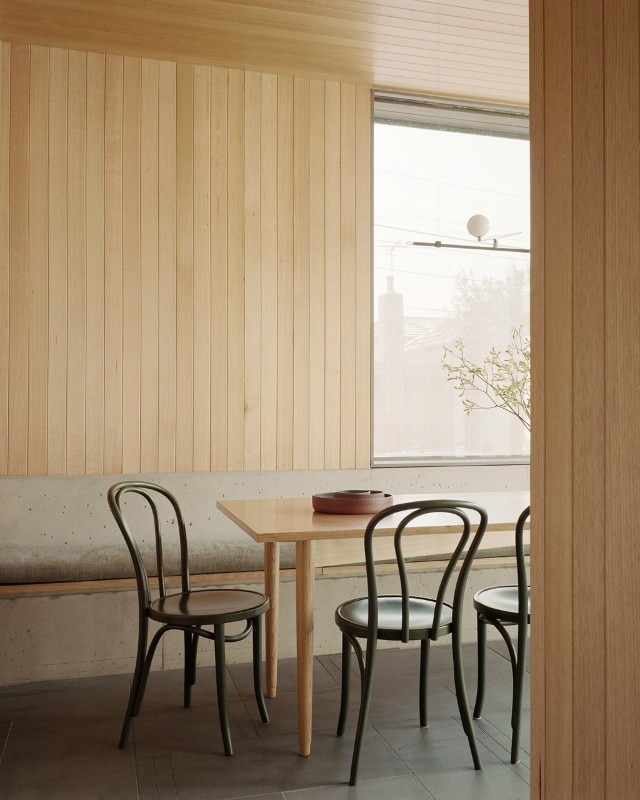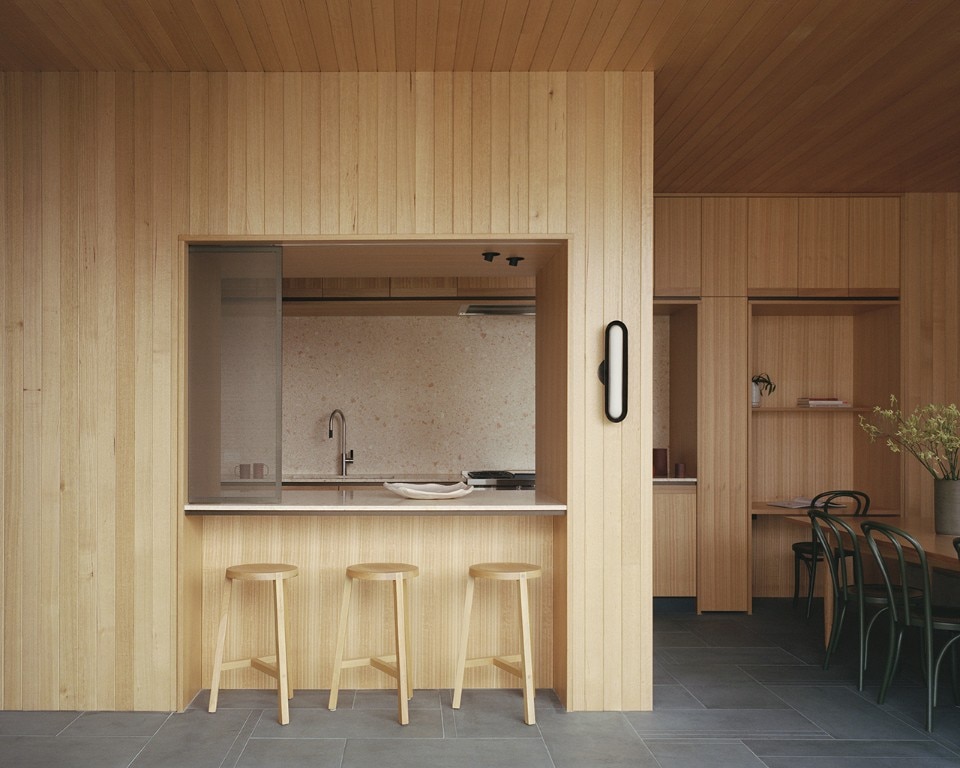“The backyard pool is reimagined and sequestered in a room-like space recalling a colonnaded Roman bath. The backyard is then free from the usual pool fence requirements and the activated upturned arches are better for sitting in and for playing,” the architects explain.