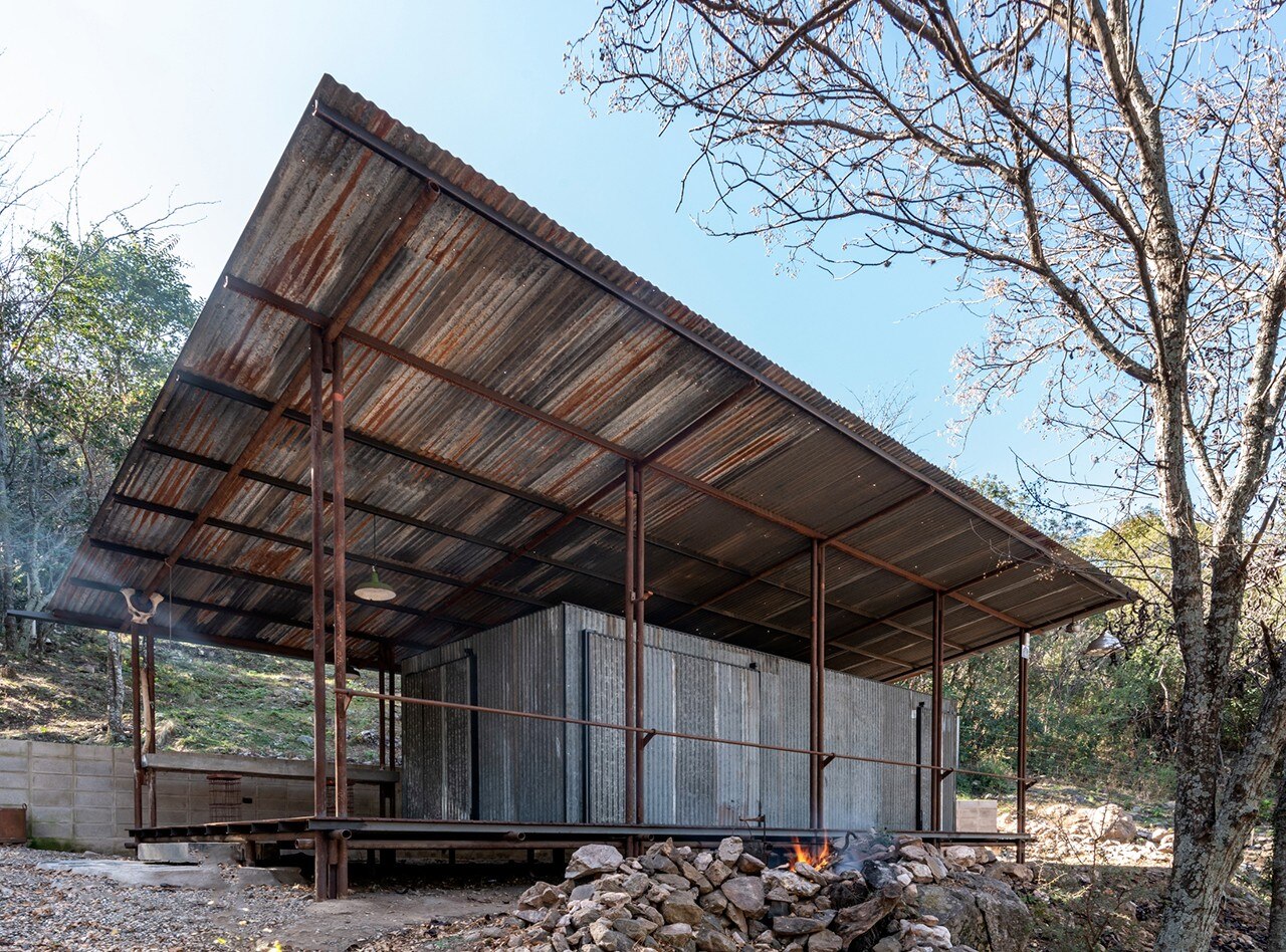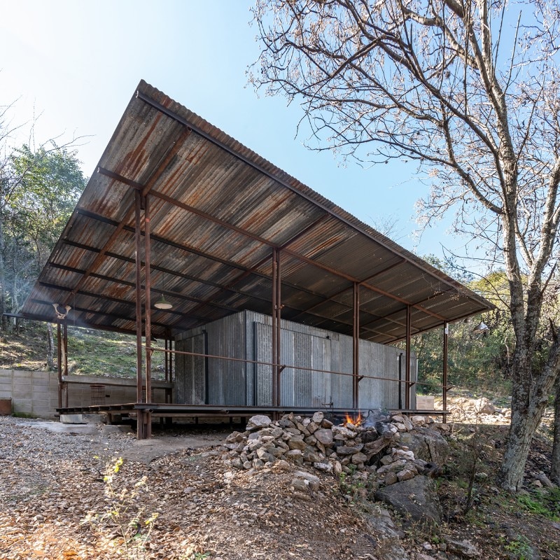 The project consists of three main elements: a raised platform, which resolves the slope of the ground and protects the shelter from the humidity of the soil; a simple prism characterised by a metal skin and sliding openings, which allow the volume to close completely; a large roof, also made of metal, supported by the structure of innocent pipes and covering the entire living area, both inside and outside.
