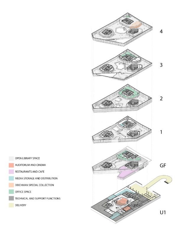 Accessible on three sides, the library organises closed spaces and niches around three self-supporting book towers in order to free the facades and invite light in. The library includes a cinema and a 200-seat auditorium in the basement, a restaurant and recording studios.
