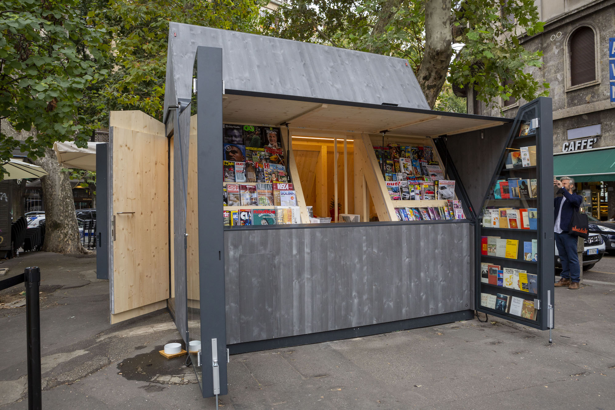 While at night, when closed, the newsstand takes on a compact appearance – with steel profiles and visible parts in dark gray painted wood – during the day, thanks to some movable elements, it takes on the iconic shape of the hut, primordial shelter and basic structure of the architecture, making the space inside the cabin more practical and functional.
