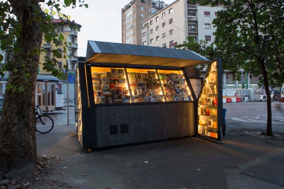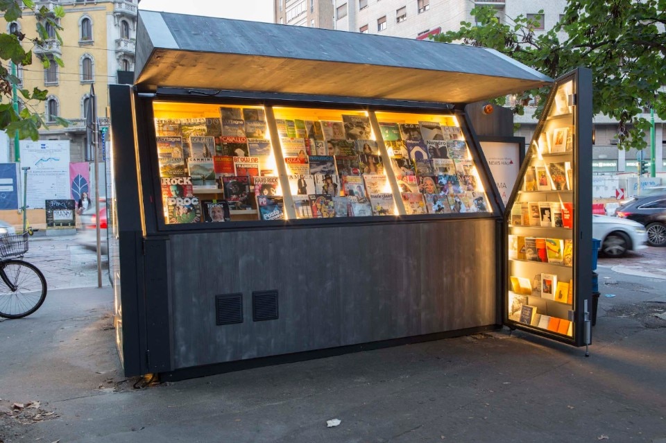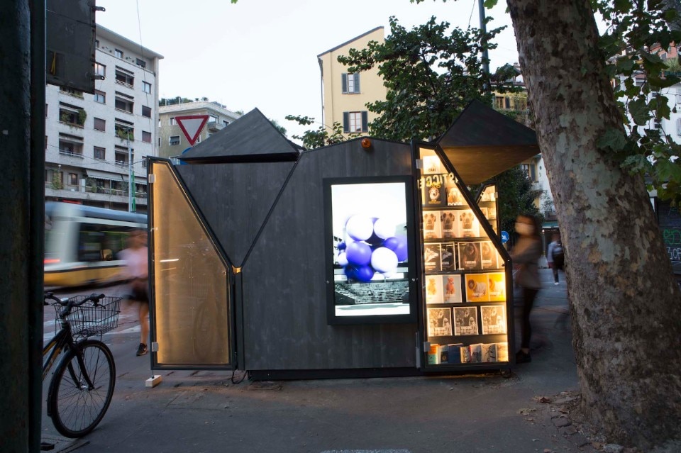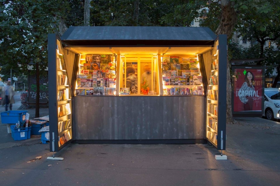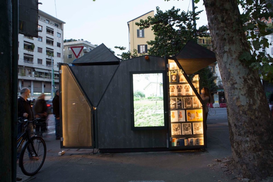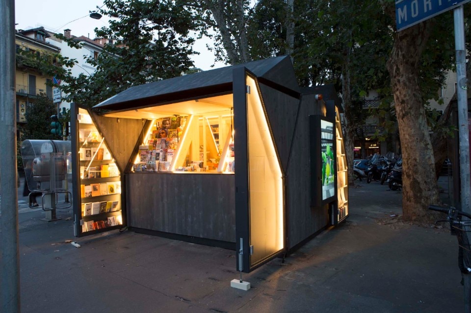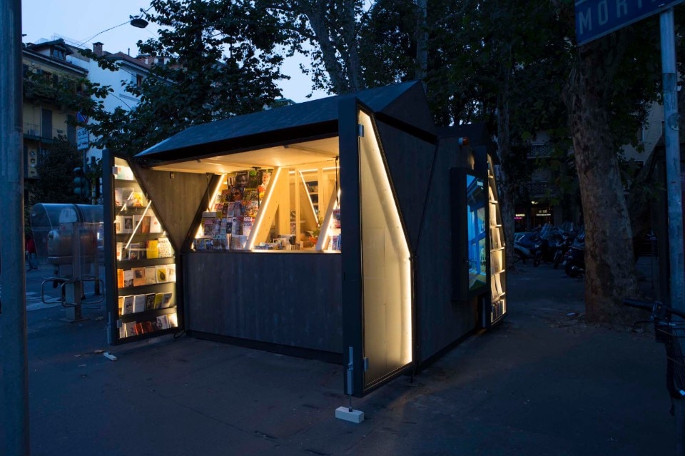 While at night, when closed, the newsstand takes on a compact appearance – with steel profiles and visible parts in dark gray painted wood – during the day, thanks to some movable elements, it takes on the iconic shape of the hut, primordial shelter and basic structure of the architecture, making the space inside the cabin more practical and functional.
