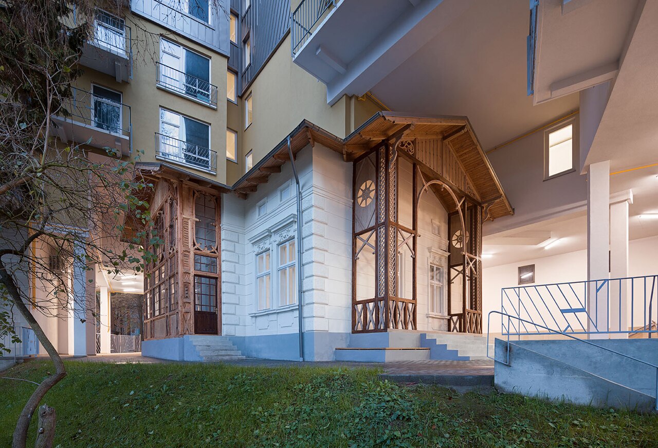 In Lviv, Symmetry integrates a late 19th century suburban house in a new high-density residential complex, which is its contemporary and supersized version.