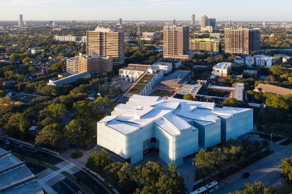 The Kinder Building, which houses a collection of 20th- and 21st-century art, along with the Glassell School of Art (also by Holl, completed in 2018), thus becomes part of the Susan and Fayes S. Sarofim Campus next to Isamu Noguchi’s Cullen Sculpture Garden (1986). The main campus includes the original site of the museum, a neoclassical building by William Ward Watkin from 1924, the two extensions by Ludwig Mies van der Rohe (Law Building, 1958 and 1974), and the Beck Building by Rafael Moneo (2000). Some underground passageways connect the buildings and house site-specific environmental works by Ólafur Elíasson (between Kinder and Glassell) and Carlos Cruz-Diez (between Kinder and Law).