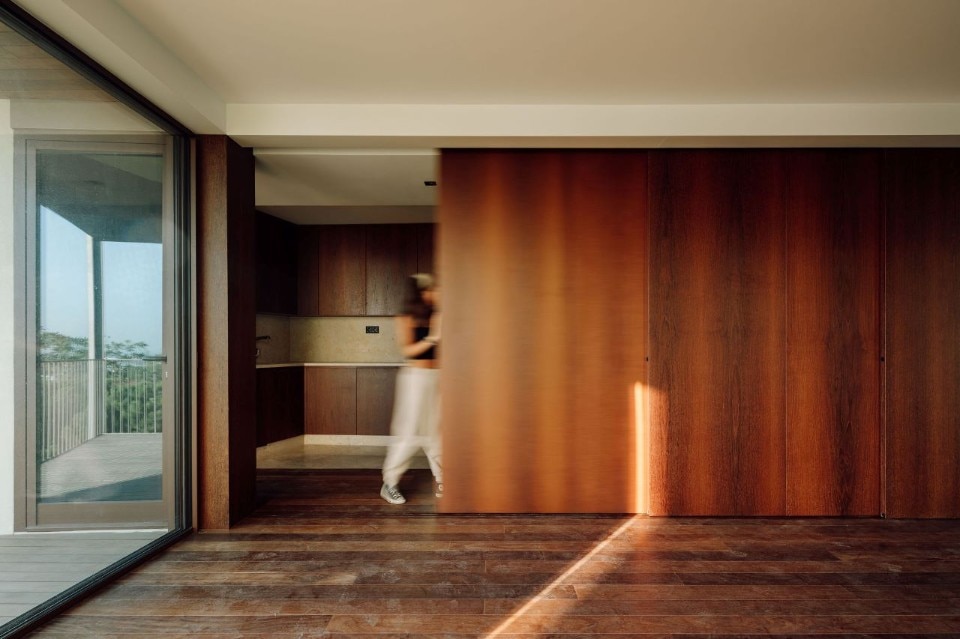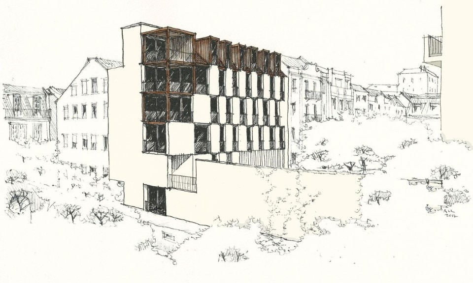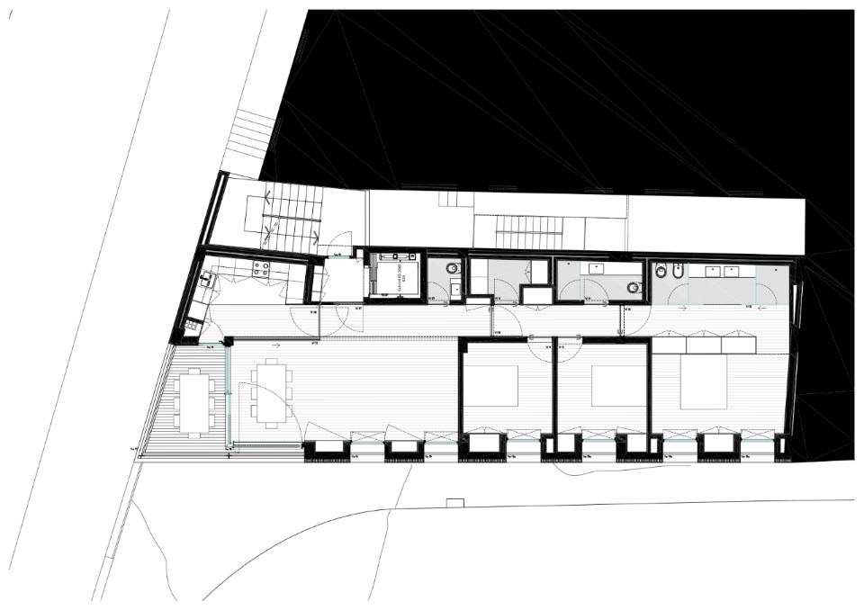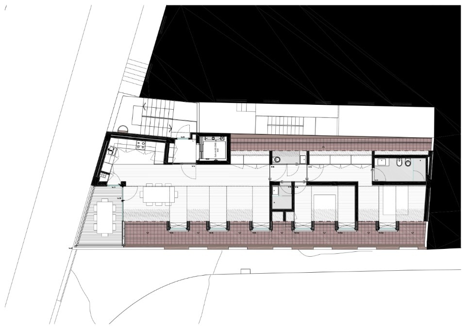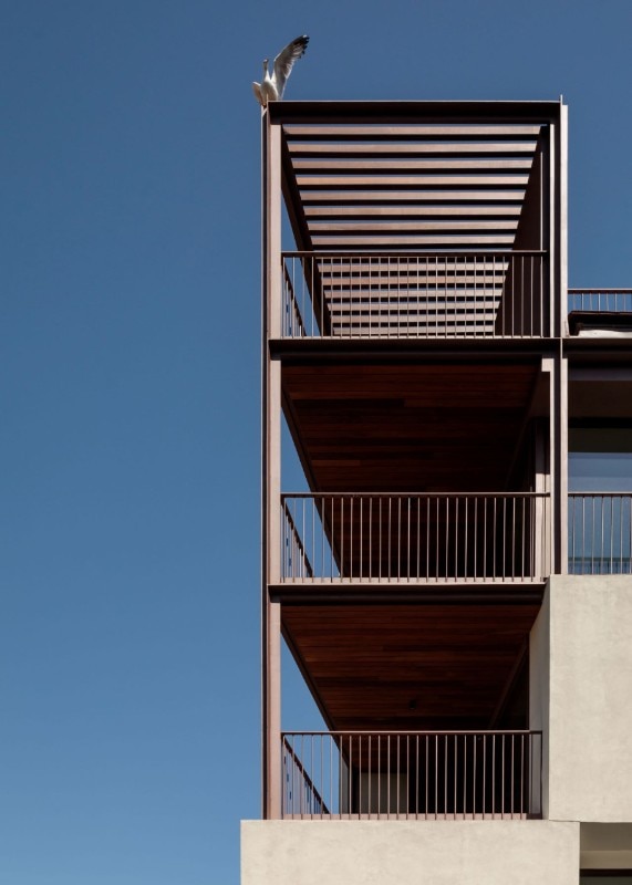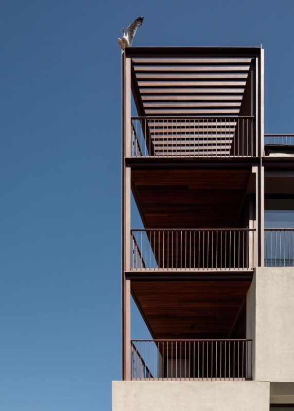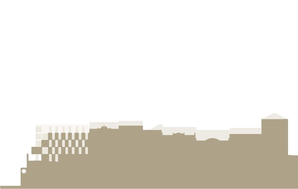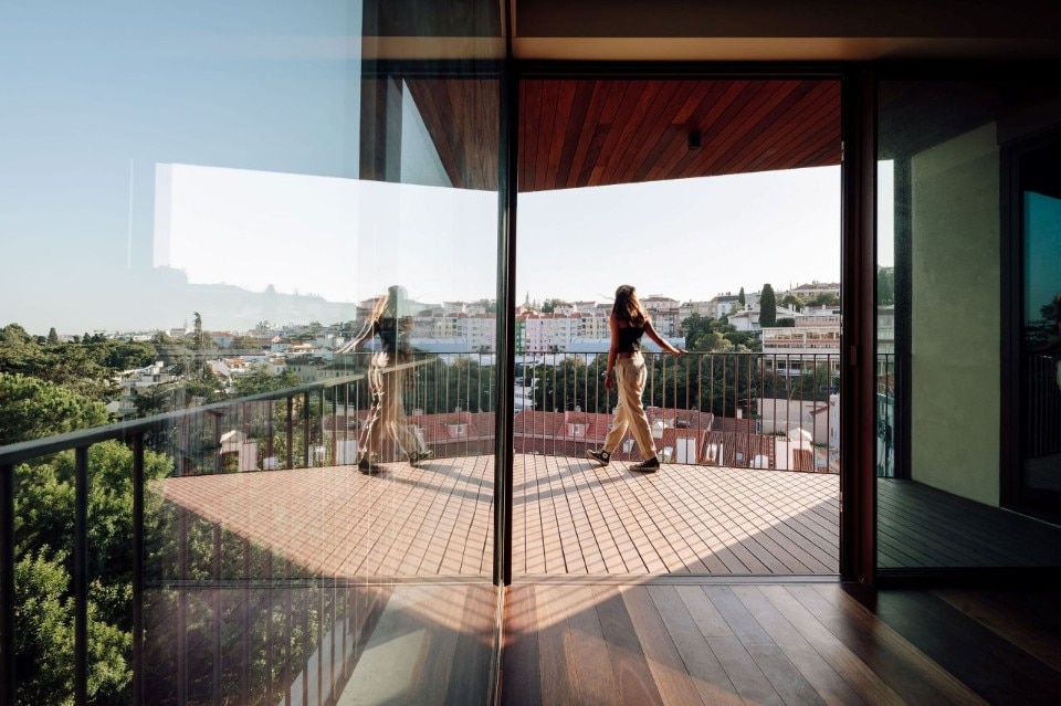 The six-storey building is defined by a cream-coloured façade that seems to dematerialise as it proceeds westwards: on this side the cladding leaves space for the metal structure, which interrupts the regularity of the east part and creates a series of open terraces overlooking the city, just above the aqueduct. The interiors develop along a corridor that separates living room and bedrooms from restrooms, offering spaces covered with wood and sliding panels.