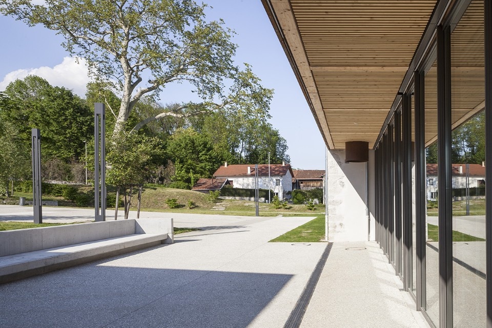 Wood and stone define the new structure creating a material continuity with the existing building, while large windows on the façades make the French studio’s design lighter. Trunks of pyramid emerge from the metal roof, serving as skylights that capture the light and bring it inside, where white spaces appear open and bright.