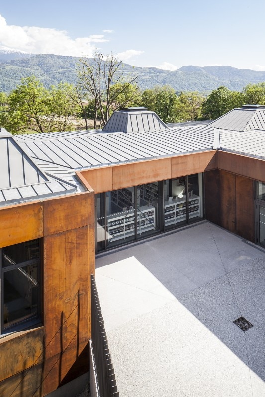 Old and new buildings dialogue through a central glazed patio, offering views of the Belledonne Chain and the Chartreuse mountains. The extension, which is C-shaped in plan, consists of two stacked blocks: the first is a stone base that follows the course of the terrain in harmony with the landscape, the other is a volume covered in corten.