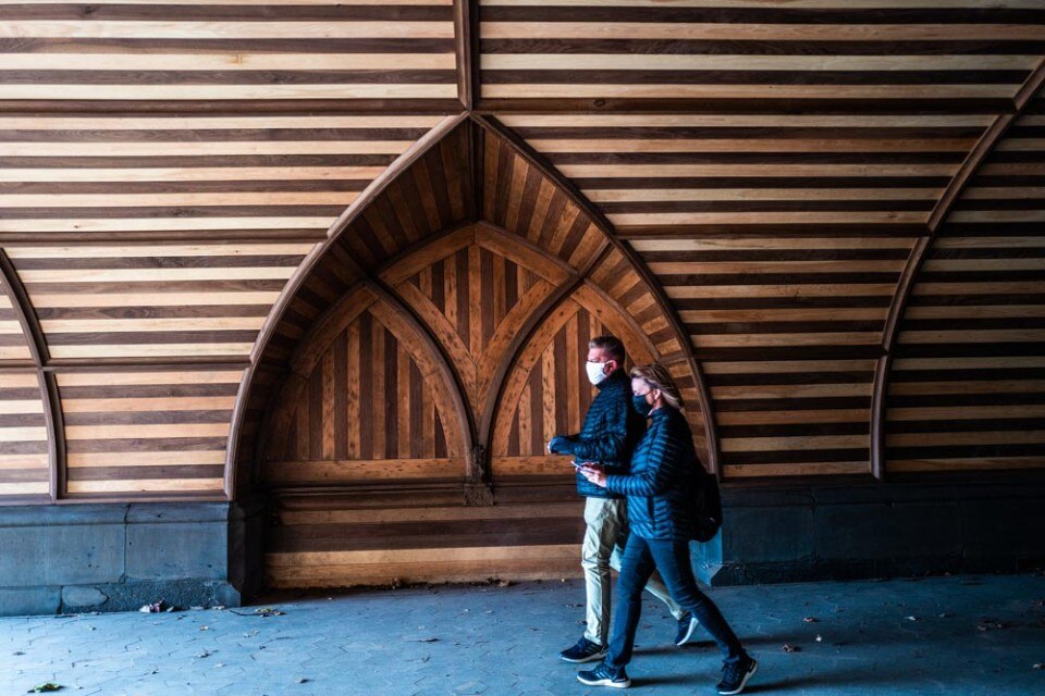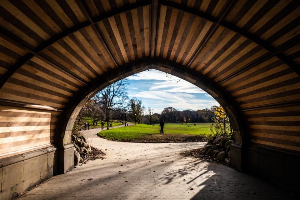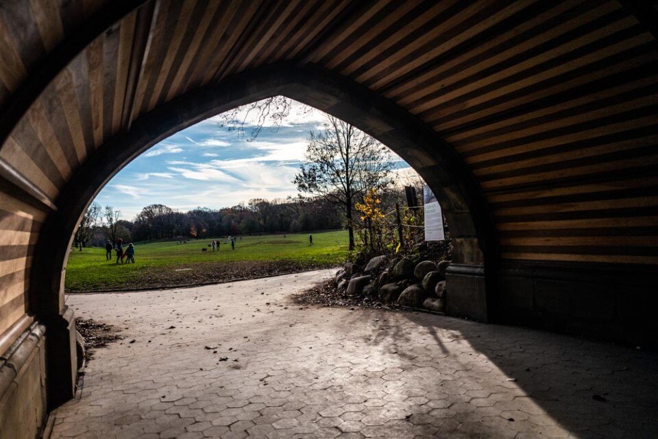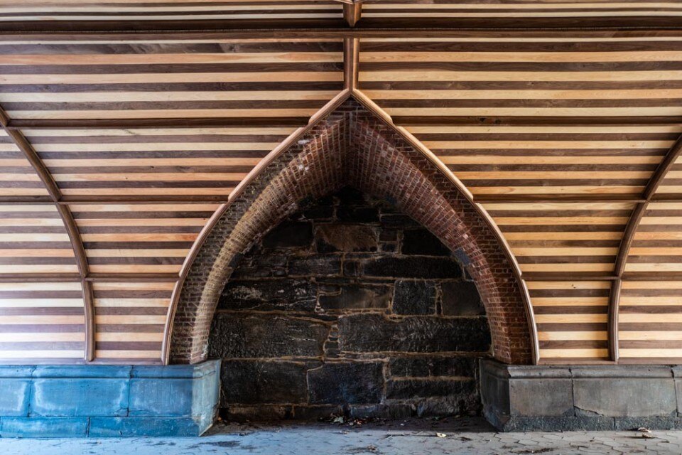 In the simplicity of the structure, the project is astonishing because the interior of the Endale Arch, once the paint that covered the interior surface was peeled off, revealed an inlay of white pine and black walnut wood panels that has been hidden for nearly a century and that now passersby, adults and children, runners and cyclists don't tire of looking at and photographing.