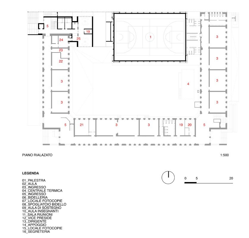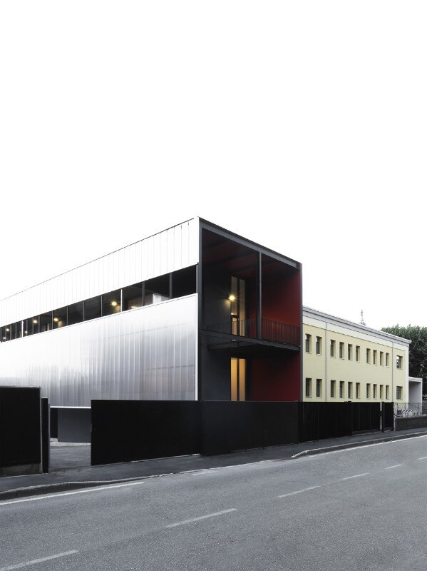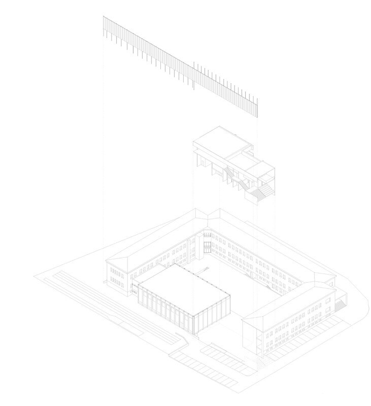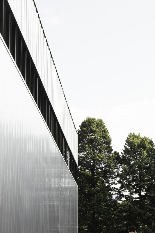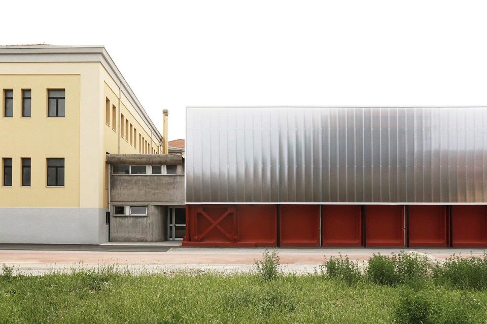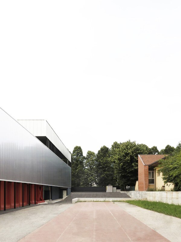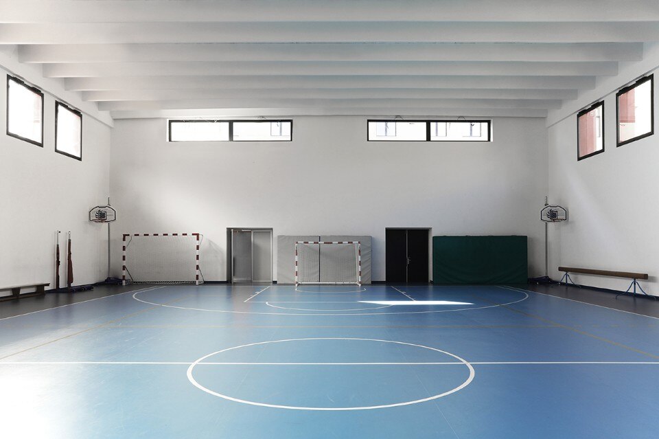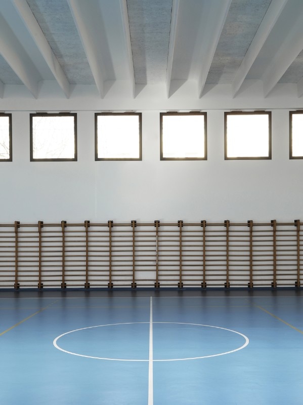 Her addition completes a complex consisting of a U-shaped building built in the 1950s, to which a gymnasium and a small service volume for changing rooms were added twenty years later. The three later additions to the original intervention - all located on the north side of the school - have been unified by a polycarbonate skin, which gives unity to the facade but reveals the differences between the different structures.
