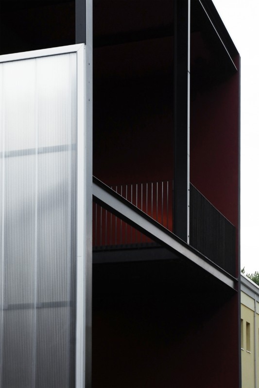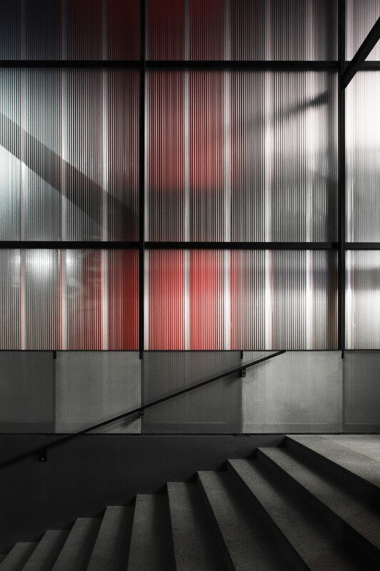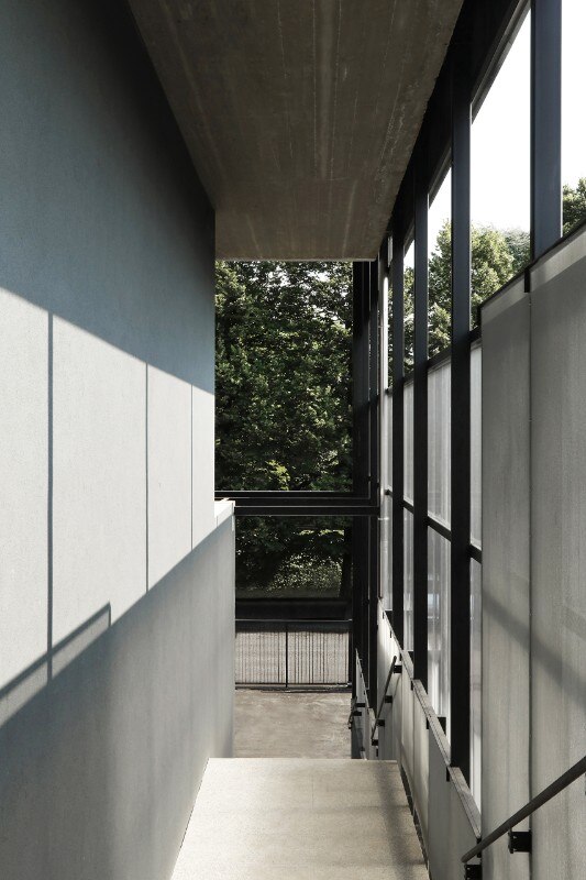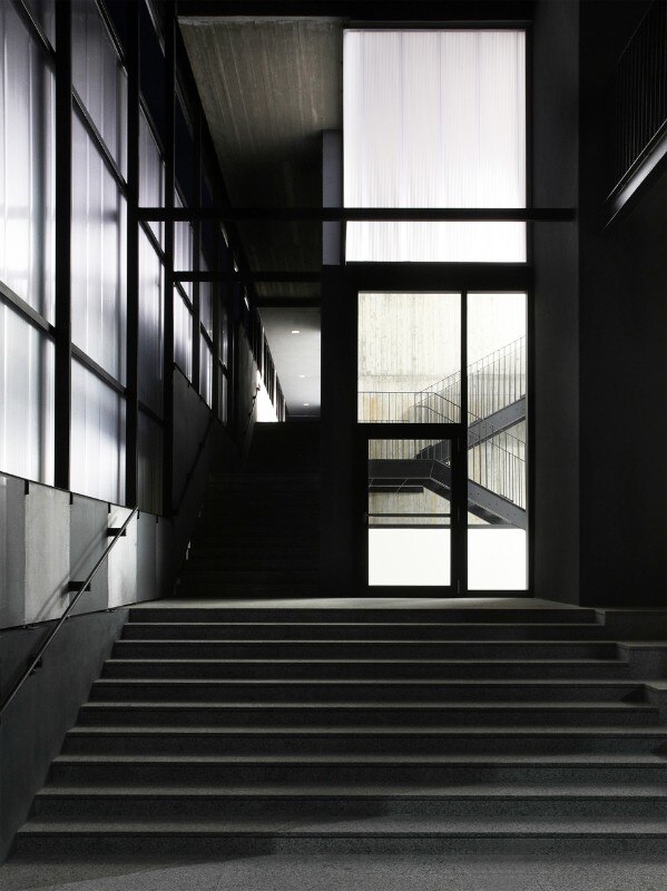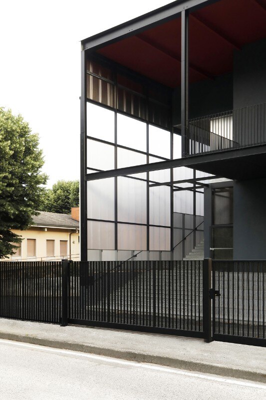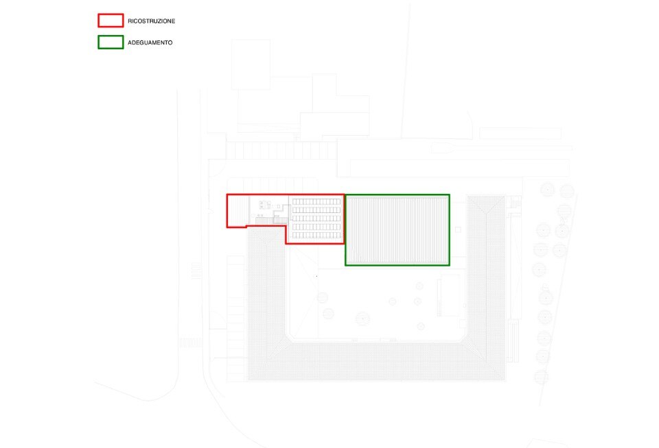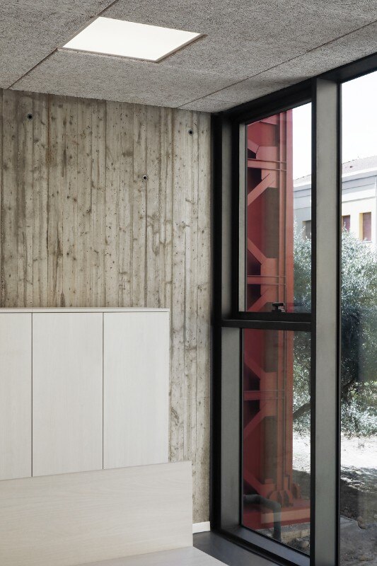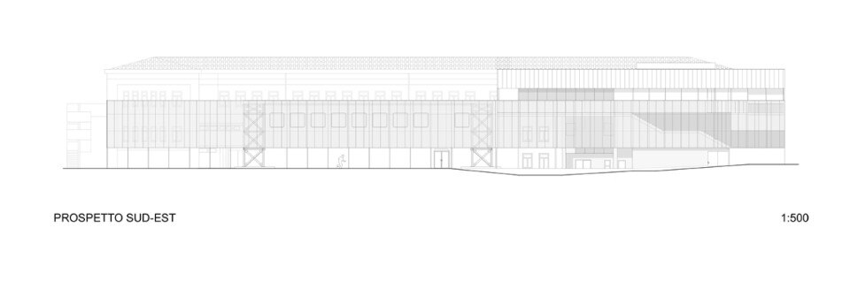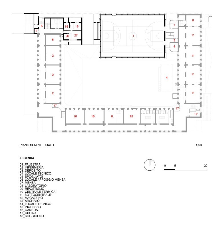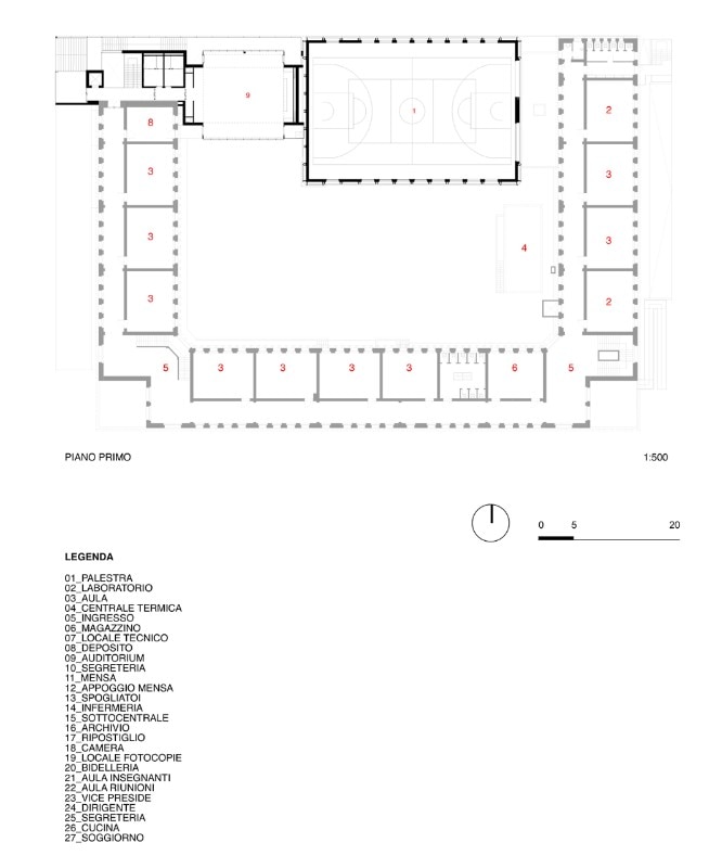 Her addition completes a complex consisting of a U-shaped building built in the 1950s, to which a gymnasium and a small service volume for changing rooms were added twenty years later. The three later additions to the original intervention - all located on the north side of the school - have been unified by a polycarbonate skin, which gives unity to the facade but reveals the differences between the different structures.