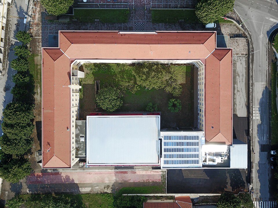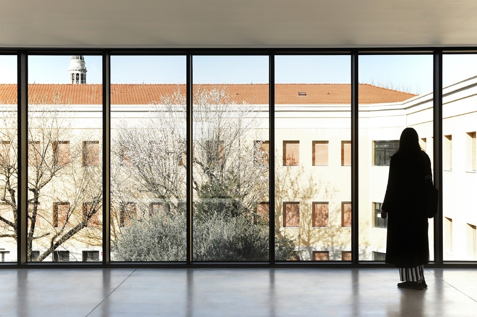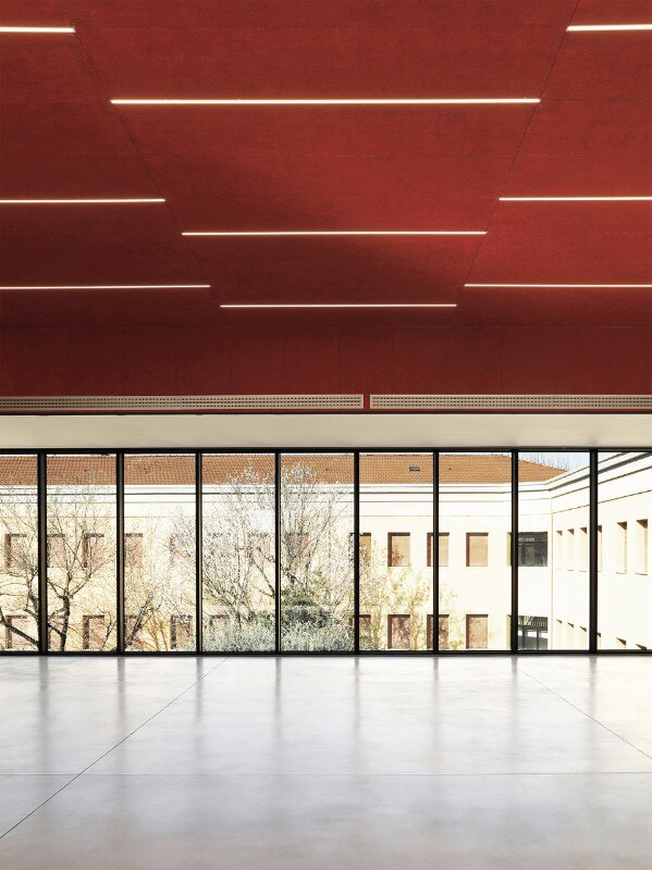 Besides various offices and service areas, the extension designed by De Appolonia contains a glass auditorium on the top floor, a new space with a symbolic value too, which looks and is looked at from every point in the school. Another fundamental component of the project is the creation of a new entrance, which becomes the main entrance to the entire complex. This represents much more than an entrance to the school, but is conceived as a meeting and aggregation space. It is probably the place where students will learn the most throughout the day.