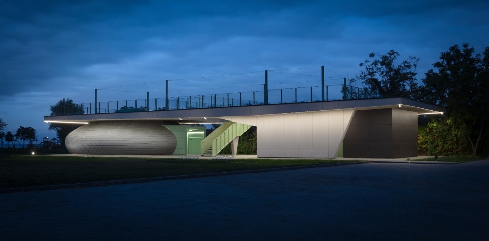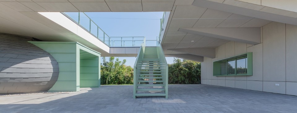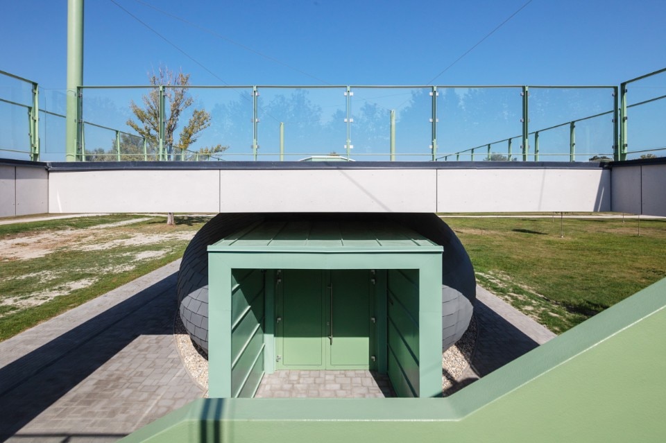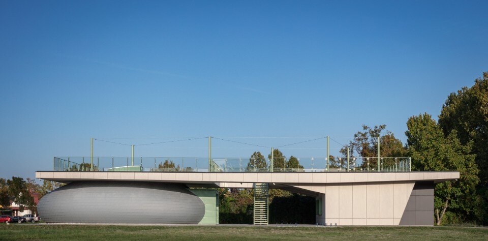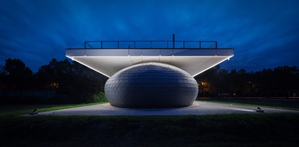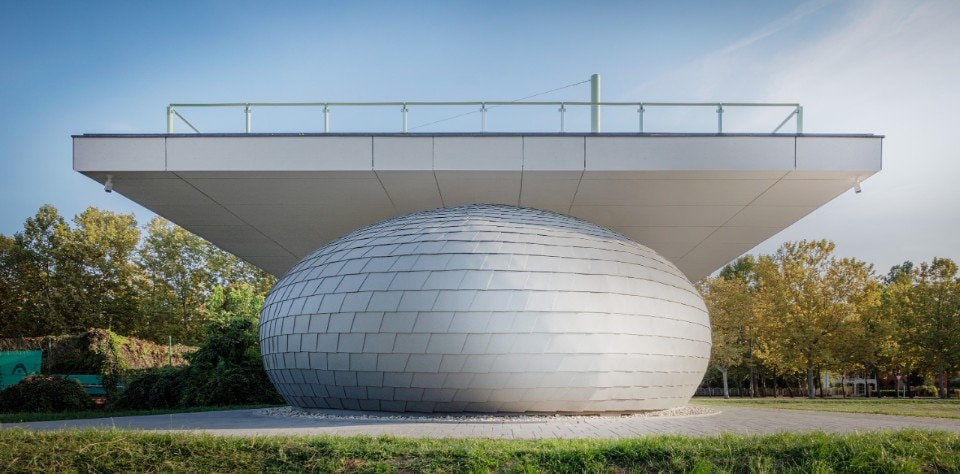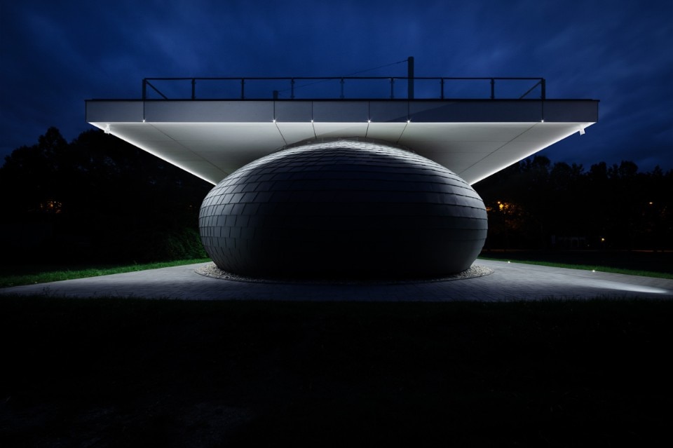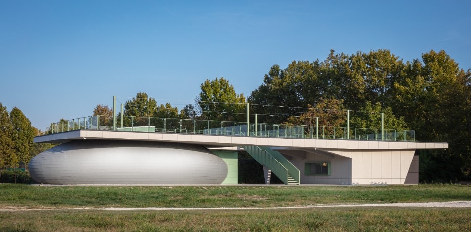 The centre is built on an area of 300 square metres and consists of two main volumes: the flattened sphere-exhibition hall and a service block including a terrace on the upper floor. The latter is extended to the exhibition space, which appears compressed under its weight. The roof terrace, open and accessible by a green metal staircase, expands the communal spaces and offers views of the landscape.