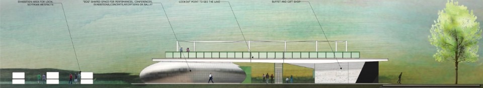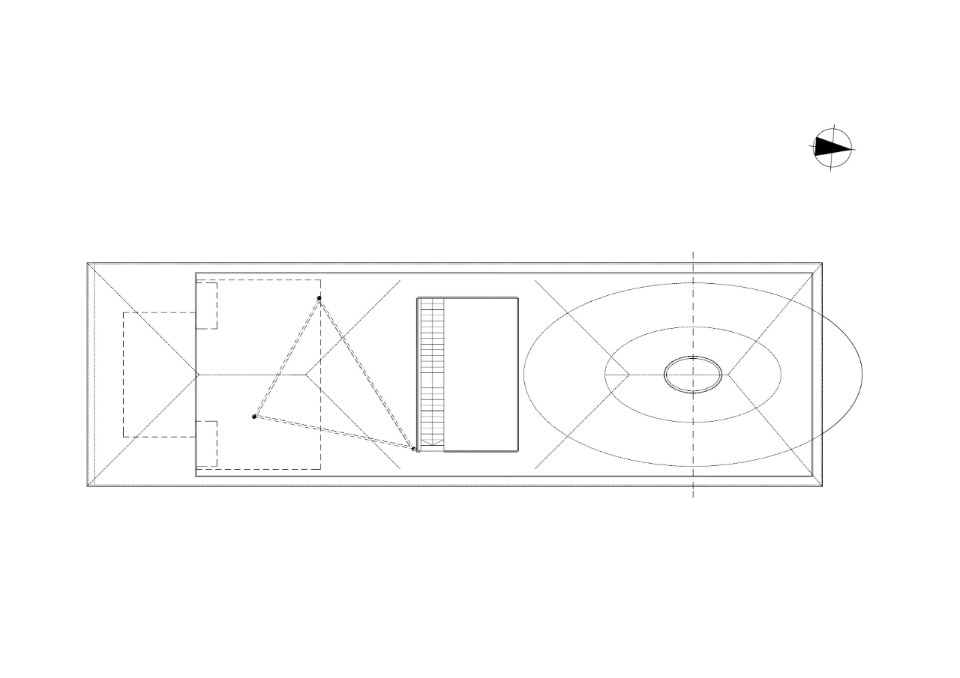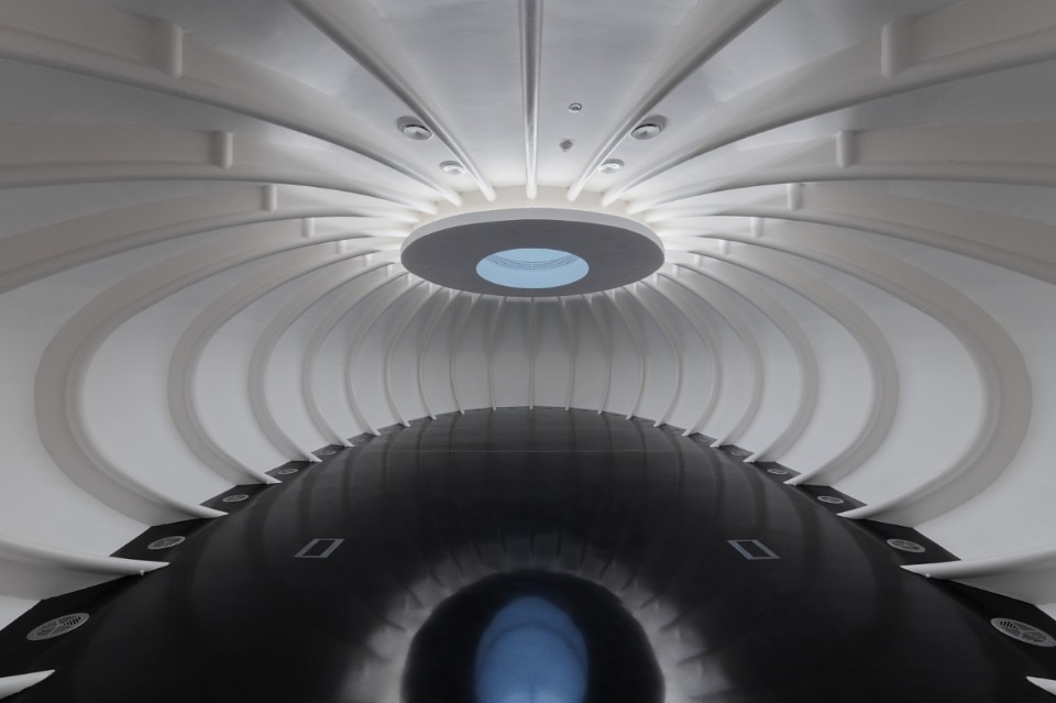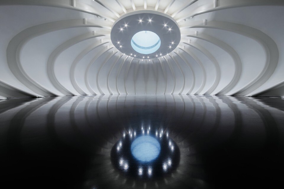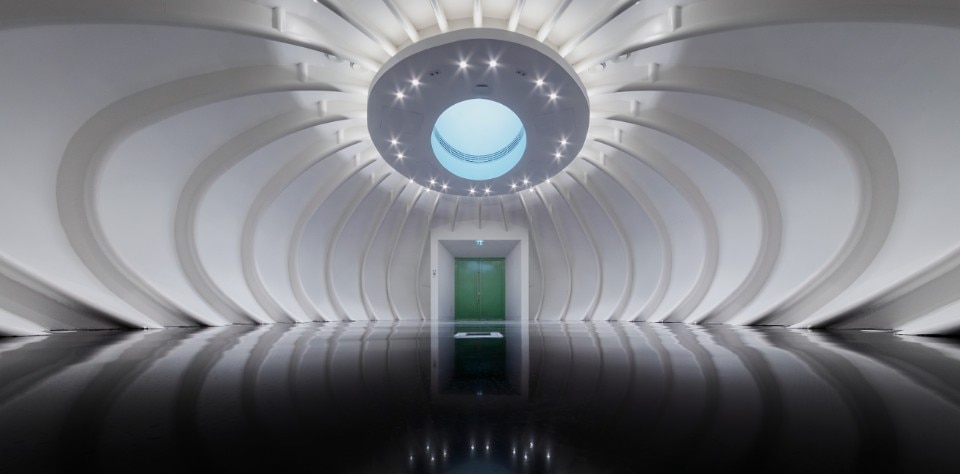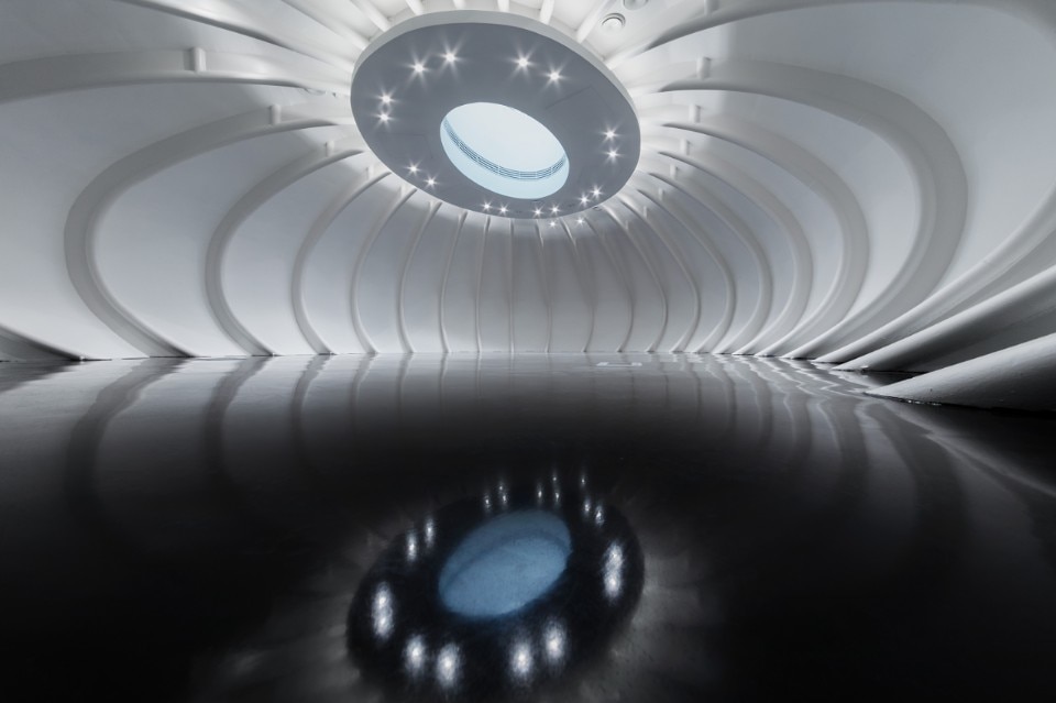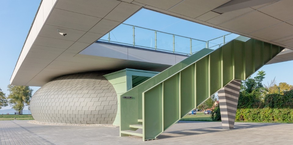 The centre is built on an area of 300 square metres and consists of two main volumes: the flattened sphere-exhibition hall and a service block including a terrace on the upper floor. The latter is extended to the exhibition space, which appears compressed under its weight. The roof terrace, open and accessible by a green metal staircase, expands the communal spaces and offers views of the landscape.