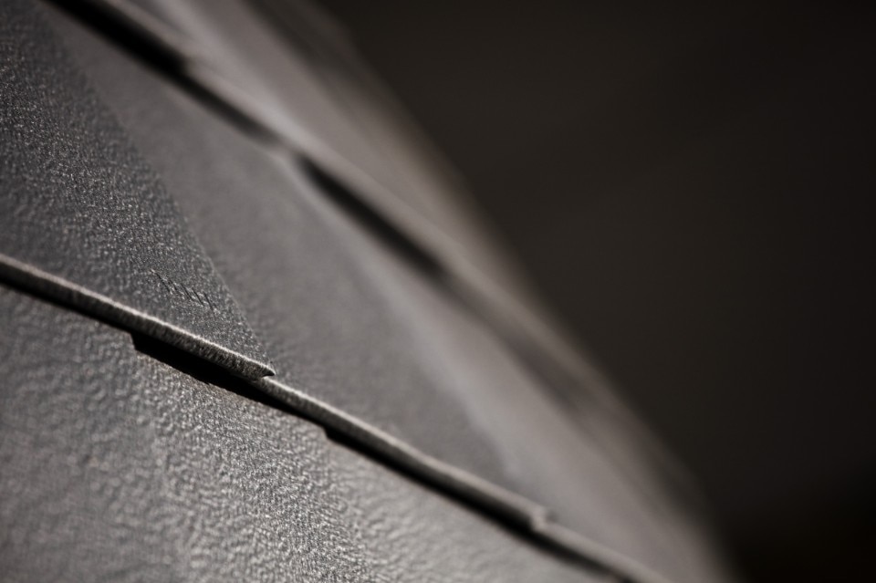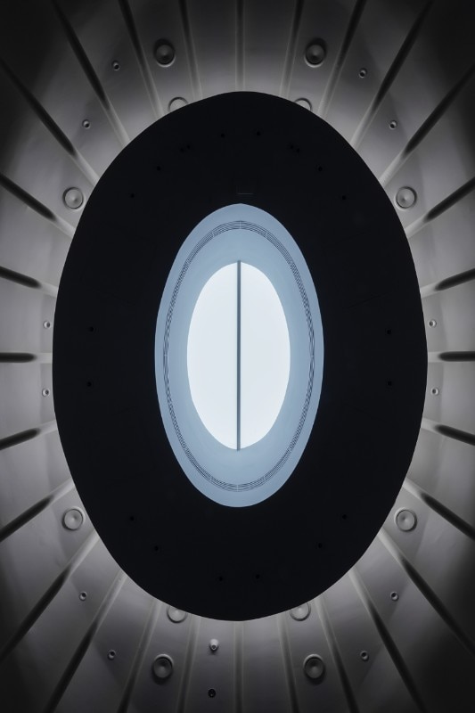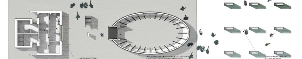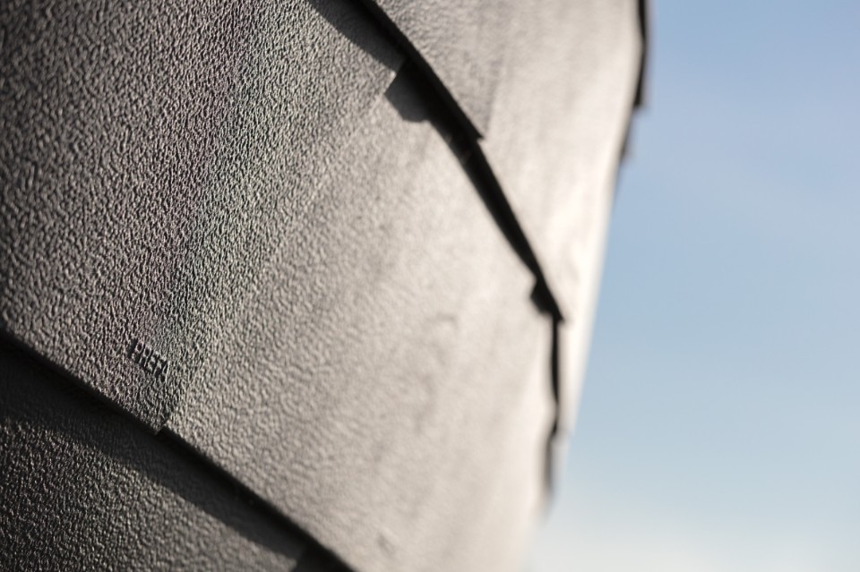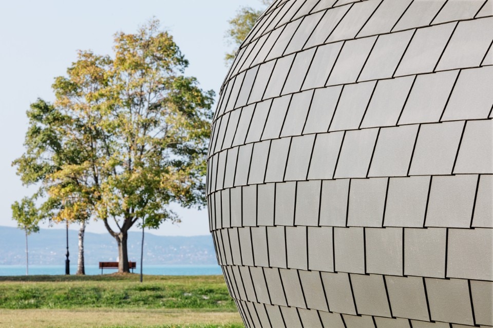 The hall has an envelope of metal shingles inspired, in form and material, by artifacts – pots, trappings, earrings – found in a 6th-century cemetery near the site and displayed in the garden. Inside, the volume is lit by a zenithal opening and characterised by rhythmic, enveloping surfaces.