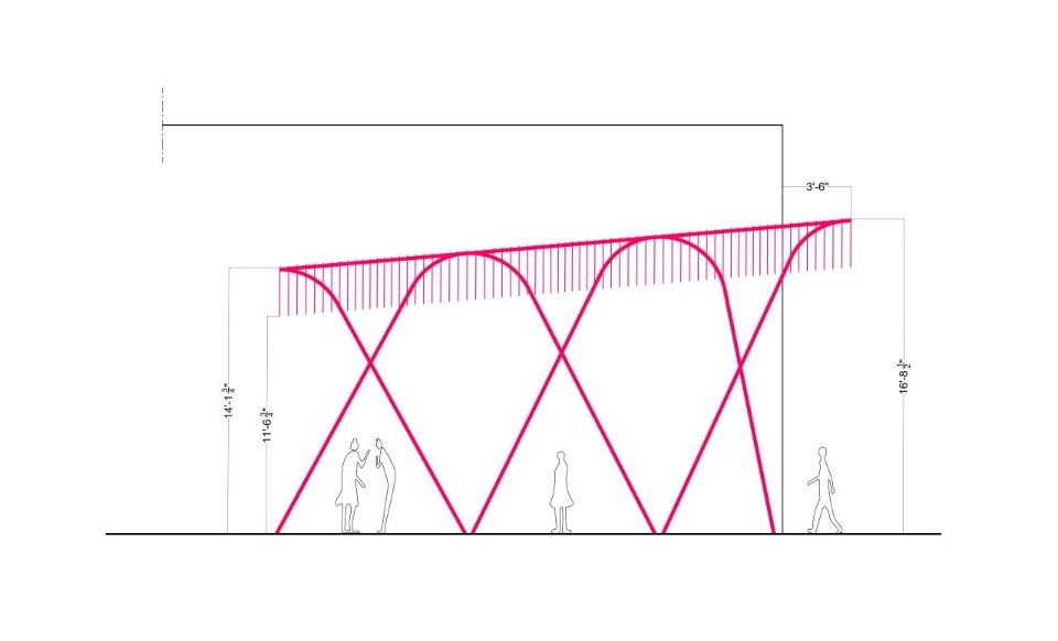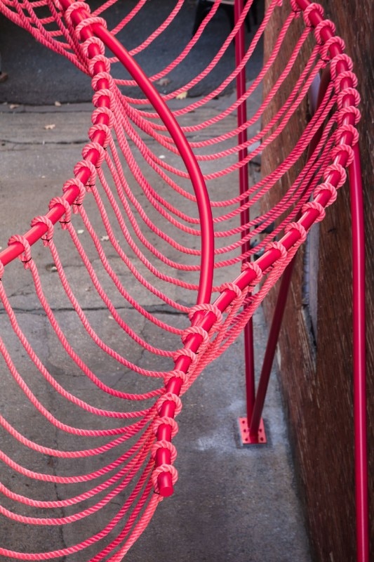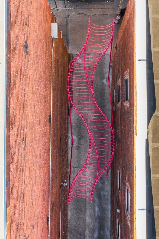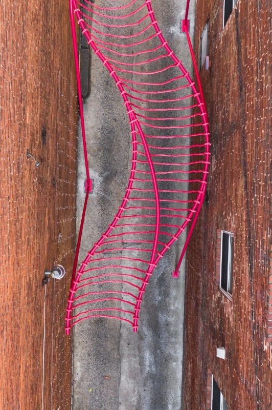The work invites people to visit the street, emphasising its depth with a specific tilt and arousing curiosity with a smooth geometry. The structure is made of bent steel and hanging nylon ropes. It runs through the space recalling the alley’s architectural elements: the arches on the windows are expressed through the curved line of the installation, while the red brick colour is reflected in the pink hue.