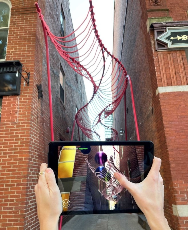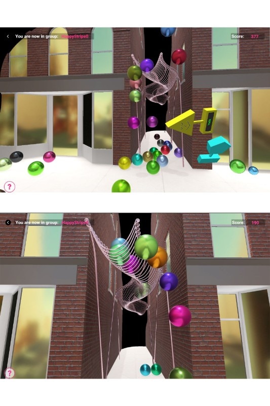 Happy Stripe is completed by augmented reality technology to generate social interaction. The digital scenario, which can be explored through an app, allows users to throw coloured balls into the sculpture, letting them play while keeping social distancing. The installation can be visited until November 2021.
