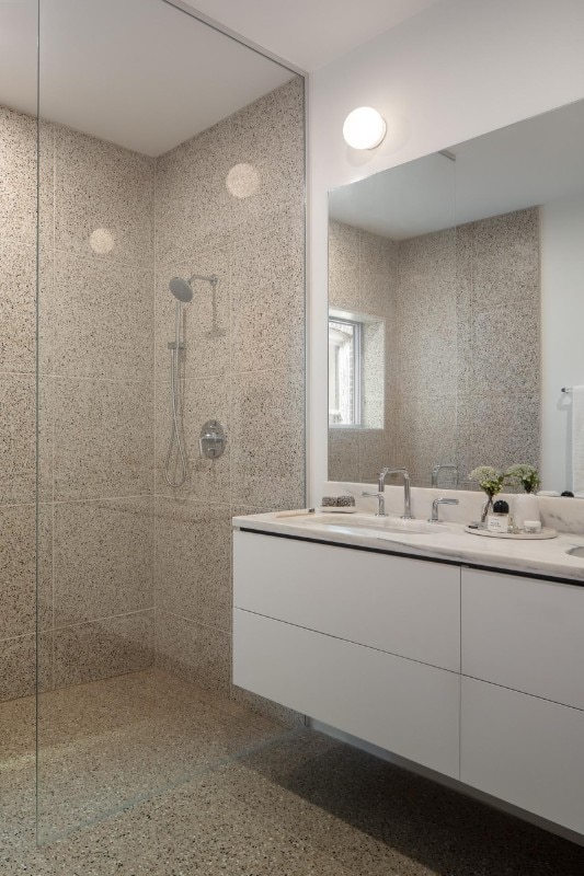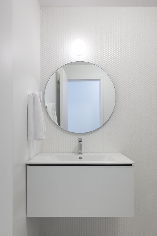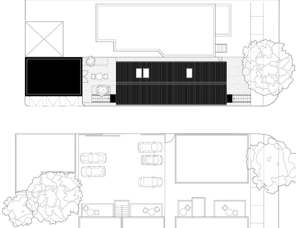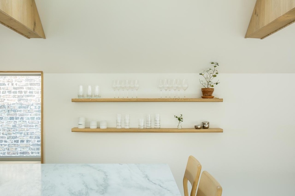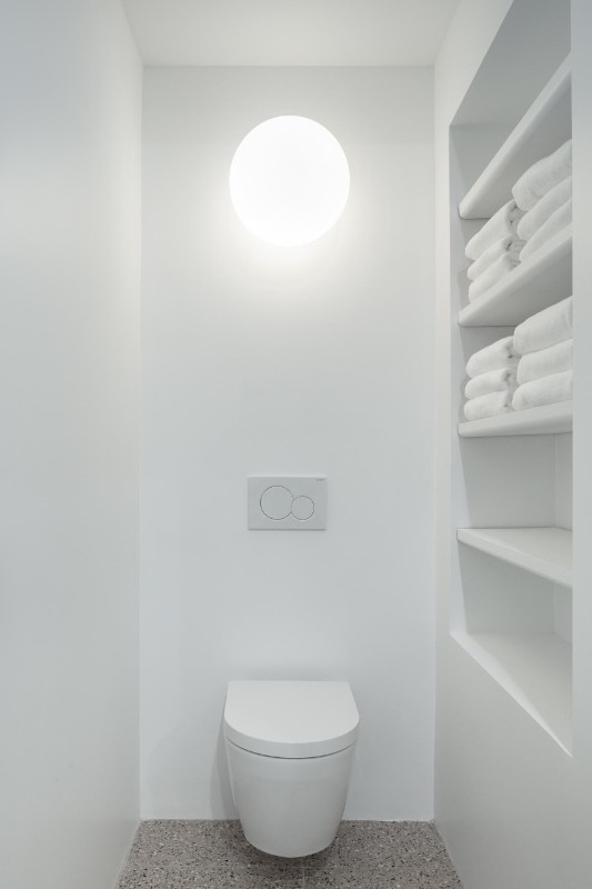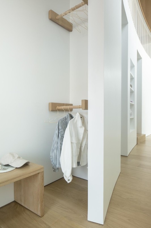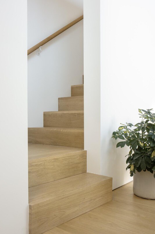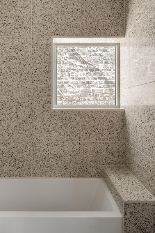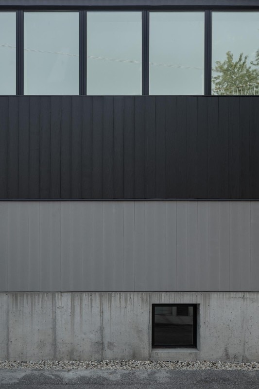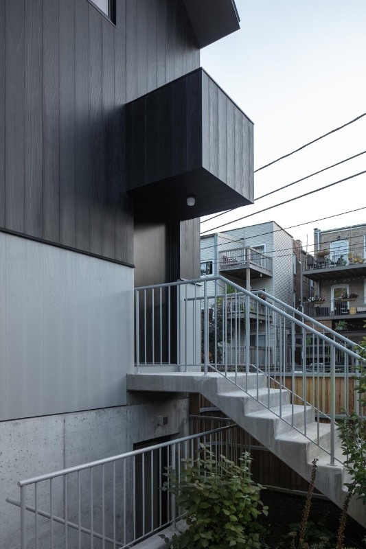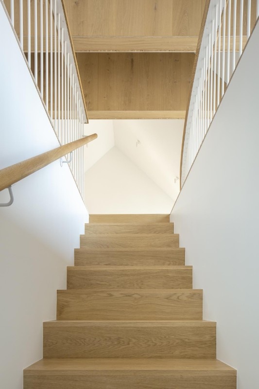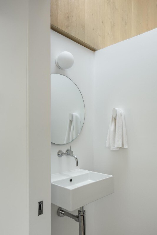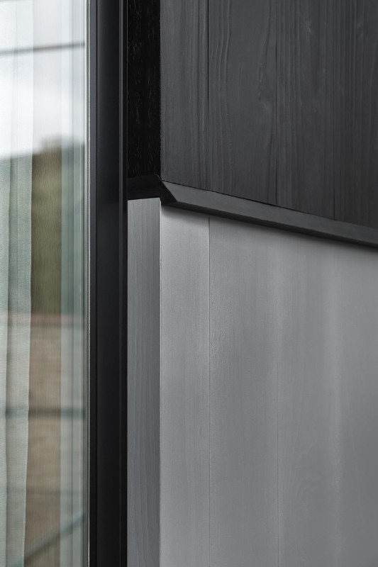 Inside as well as outside, the use of cladding contributes to building a link with the vernacular architectural typology prevalent in the block, while at the same time sublimating it through the combination of finishes. On the façade, where the arrangement of windows is an explicit reference to the idea of privacy embodied by the building - on the street front, the floor of the rooms has no openings to the outside except for a large glass door - the concrete base is enriched by two Accoya wood bands, the first in light gray and the other in black that lines the iconic silhouette of the roof, emphasizing its iconicity.