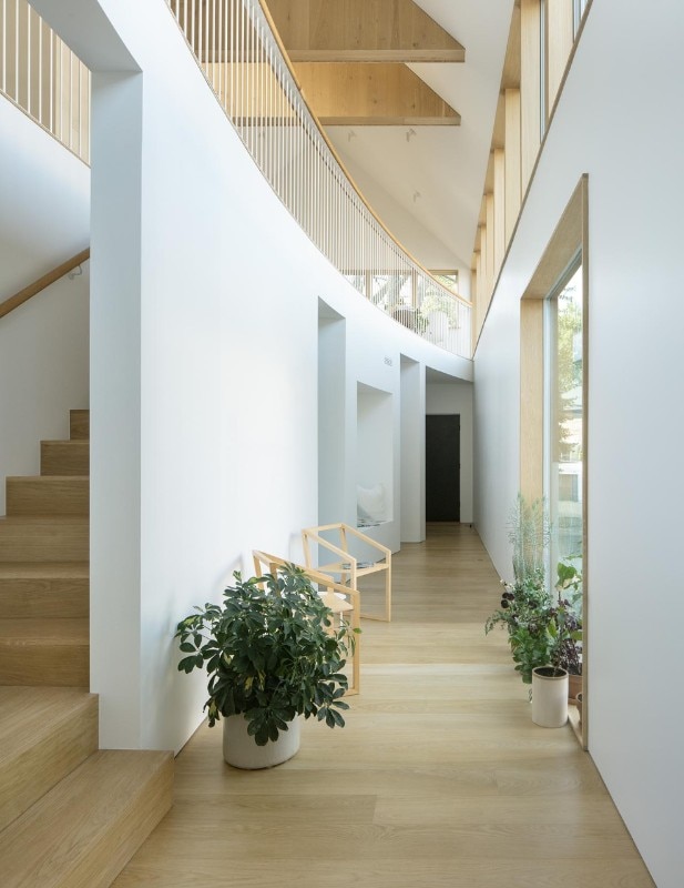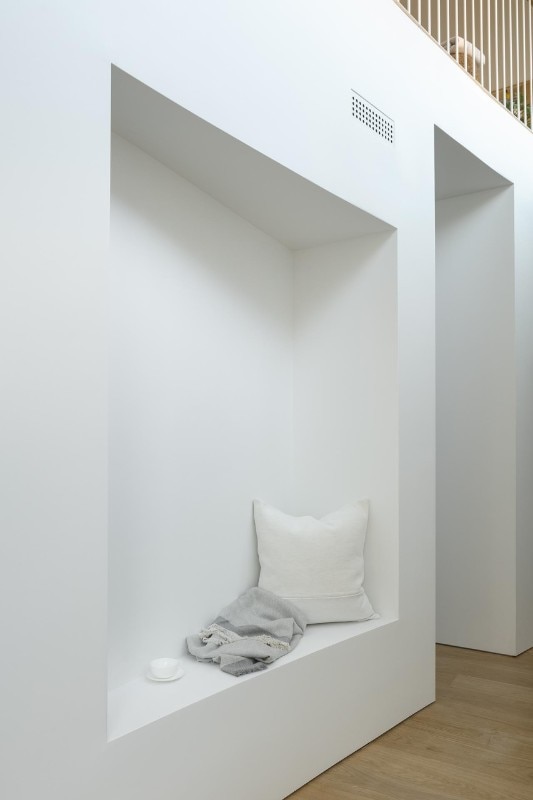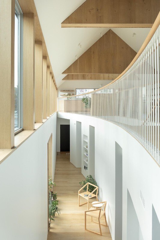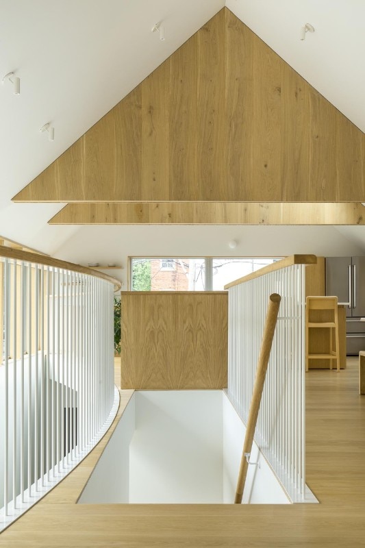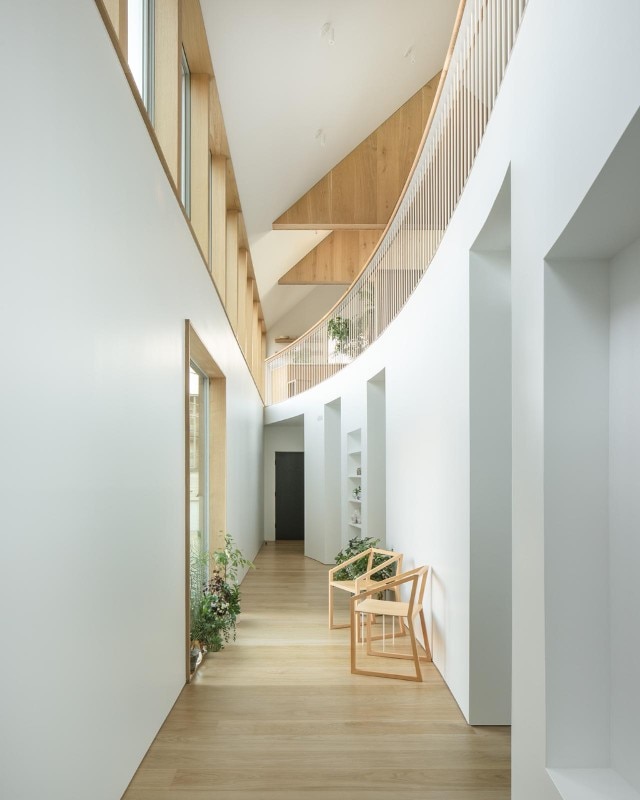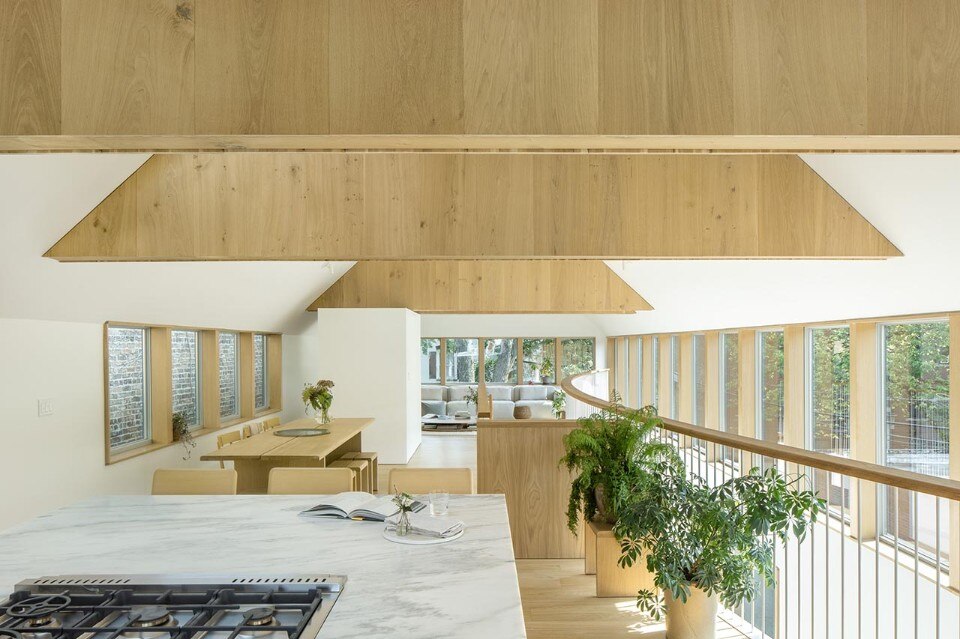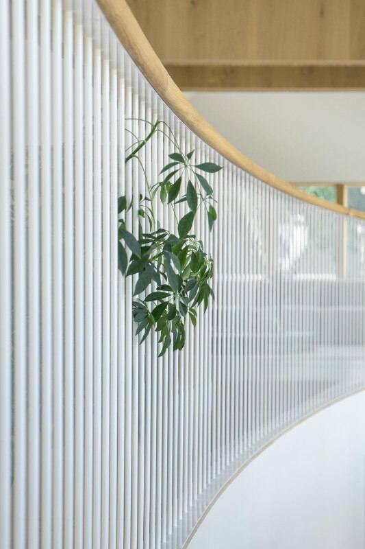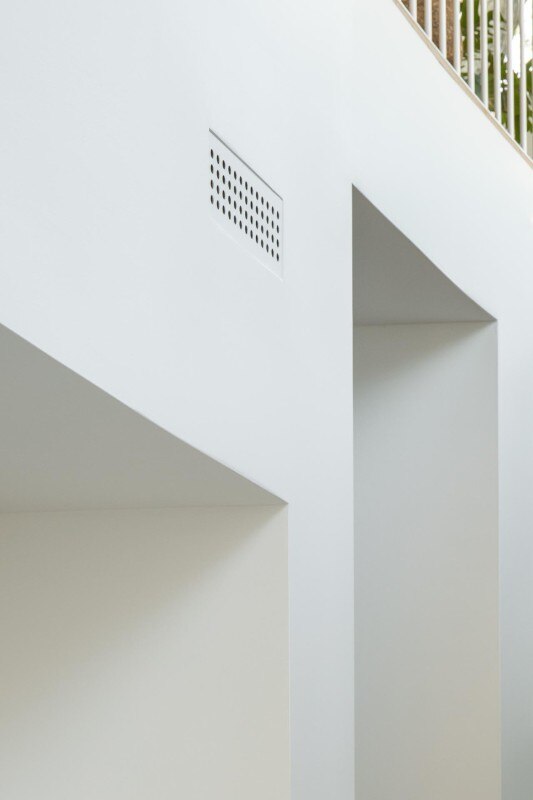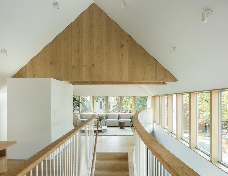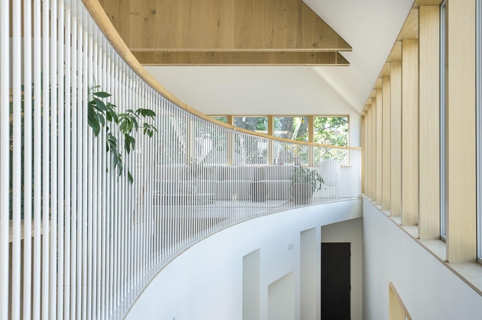 Inverted with respect to the classic division between the living area on the lower level and the bedrooms upstairs, the floors find a common front of containment in an internal double-height wall, gently curved, which outlines a shield enhancing the passage of air and light between the floors and yet protecting the view of the bedrooms, which face the private garden and the outer perimeter walls.