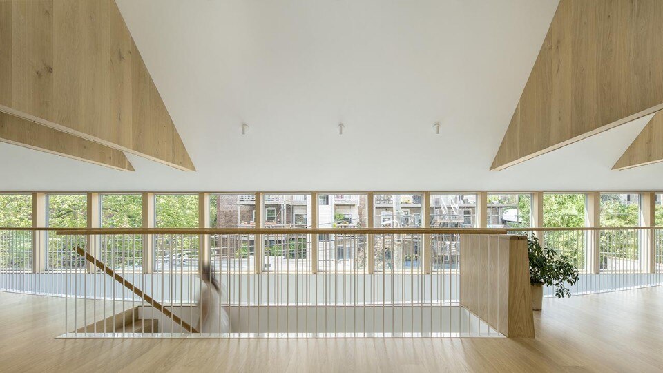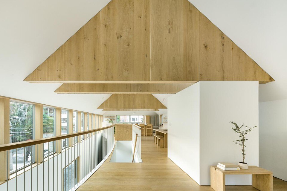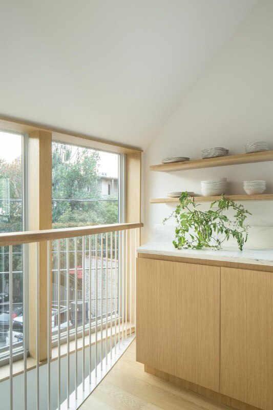 On the second floor, reached by an internal ramp, a large open space is marked by the scenic presence of cladded trusses that mark the transition between the kitchen area, dining room and living room. Invaded by the light coming from the ribbon windows, the space opens to the neighborhood and to all those details - the vegetation, the brick houses, the many suspended electric cables - that identify its unpretentious charm.