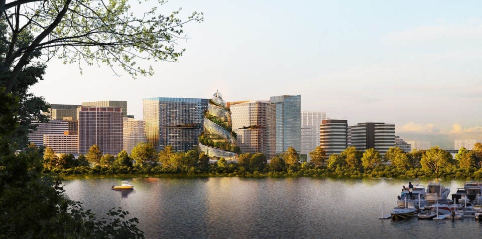 The design of the next Amazon headquarters in Arlington, Virginia, by US architecture firm NBBJ, has been unveiled. The building will be distinguished by a tree-covered glass tower that rises in a spiral shape above the rest of the city’s skyline. Amazon will call the building The Helix: “an indoor-outdoor building” open to the public that blends work spaces with two spiraling, “lush, open-air climbs to foster creativity and wellness.”
