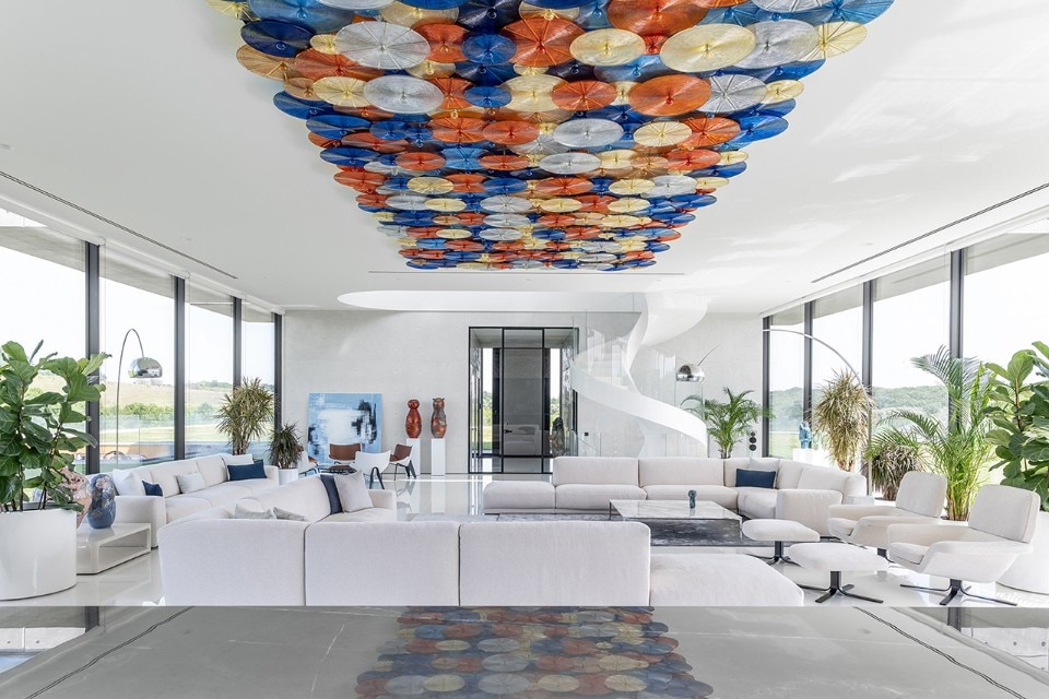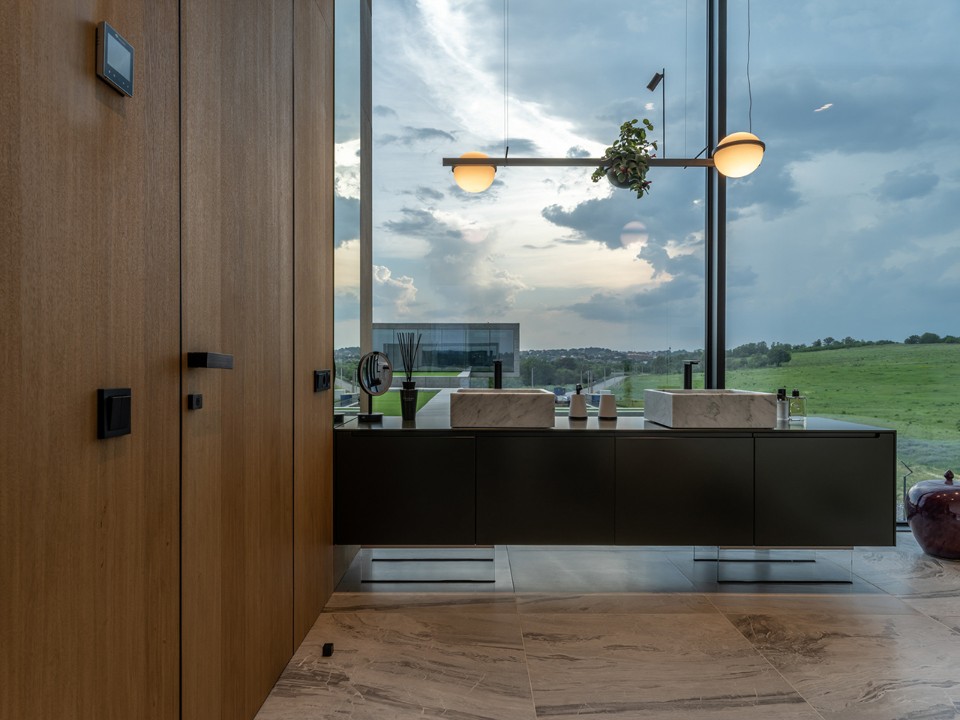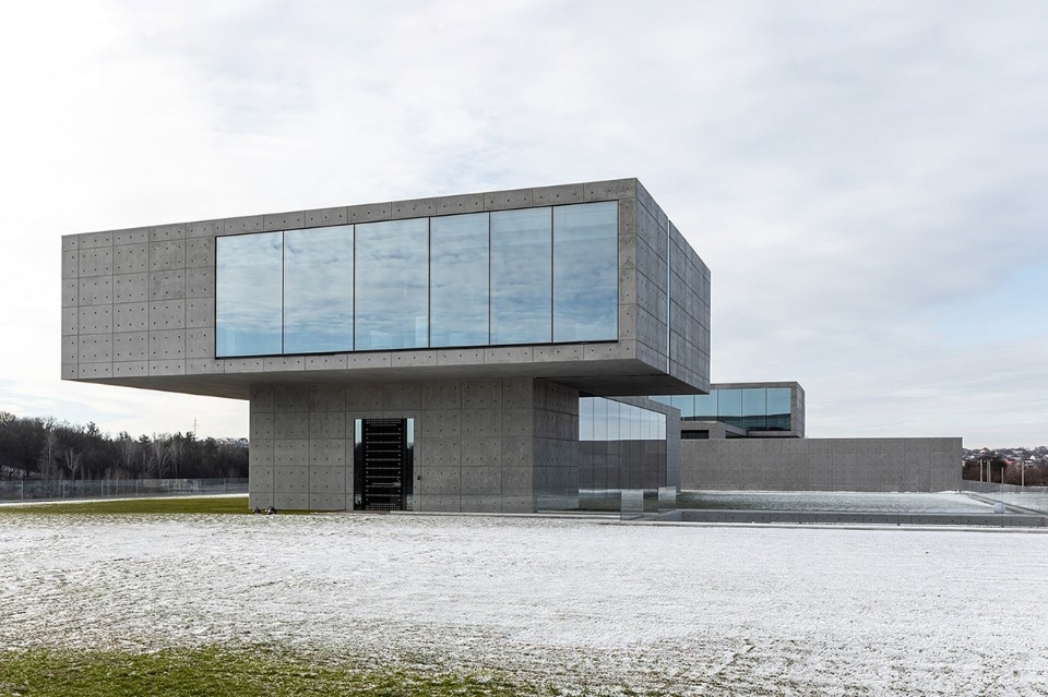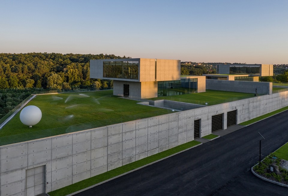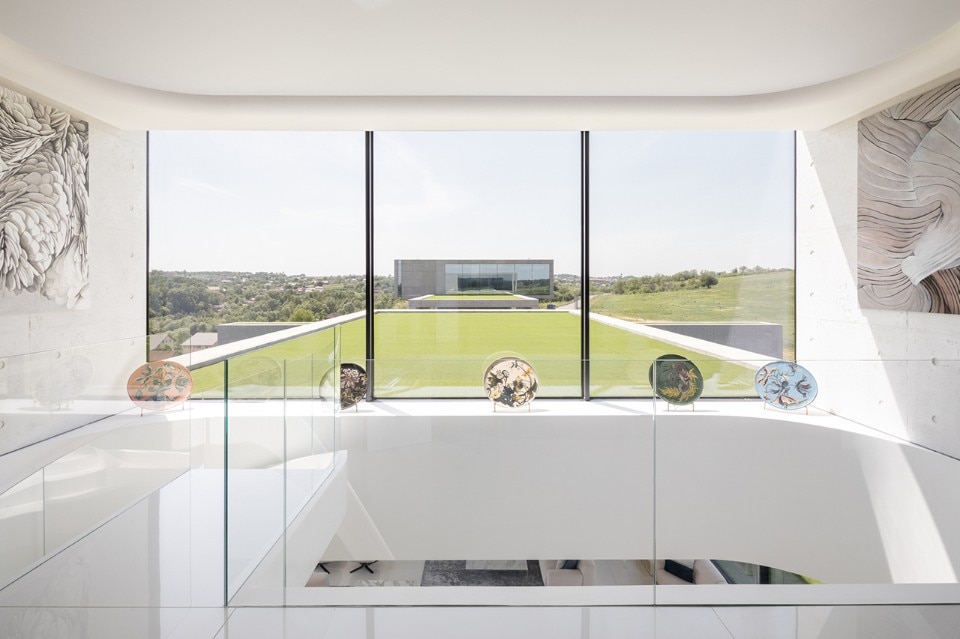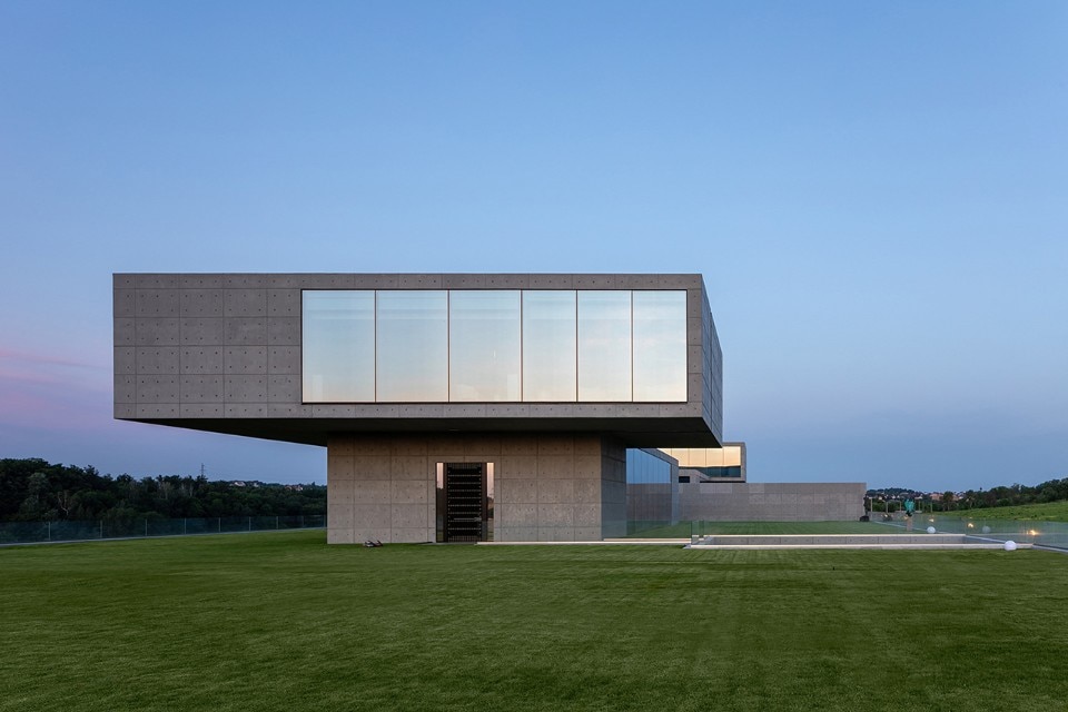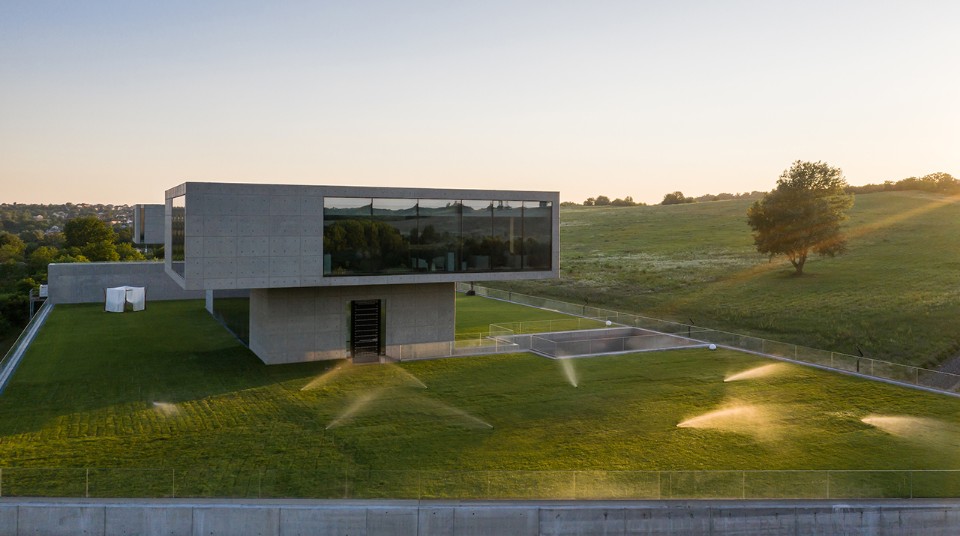 Sergey Makhno Architects' design is essential and monolithic. Twenty thousand tonnes of cement were poured to build it, and the outer facades are dotted with formwork marks (as Ando does in his projects). As you approach the house, however, you get the impression that the upper blocks are suspended in the air: their bases are hidden by the horizontal plate due to the effect of perspective. The house is equipped with a home automation system, artificial ventilation and filtering of the area, underfloor heating and glazing. All the technological components are hidden from view.