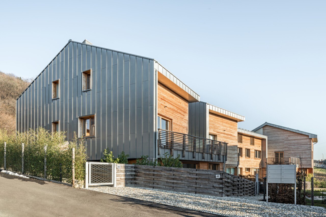 Facades with plastered cladding alternate with others covered with ventilated walls in larch staves or zinc-titanium sheet metal. In addition to this there is a skilful compositional play of overhangs and recesses, screens and openings, textures and material textures which enrich their architecture.