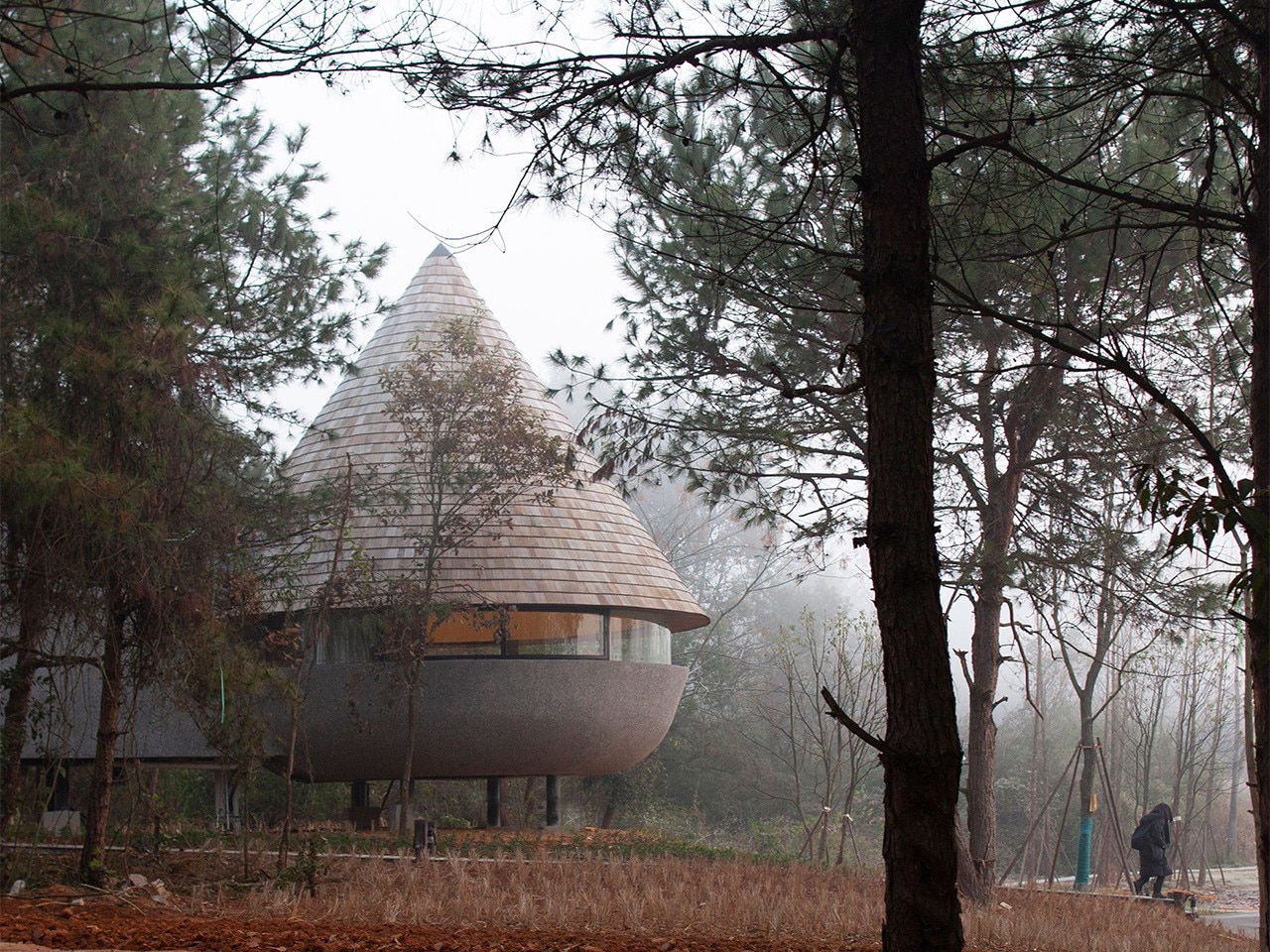 The Mushroom house has a raised steel structure to minimise the impact of the construction on the site. As time goes by, the green plants on the ground will gradually spread to embrace the building. The cone-shaped roof is covered with pine shingles, while the rest of the house is covered with granite concrete. These materials change colour with humidity and time, allowing the building to harmonise with its natural surroundings.