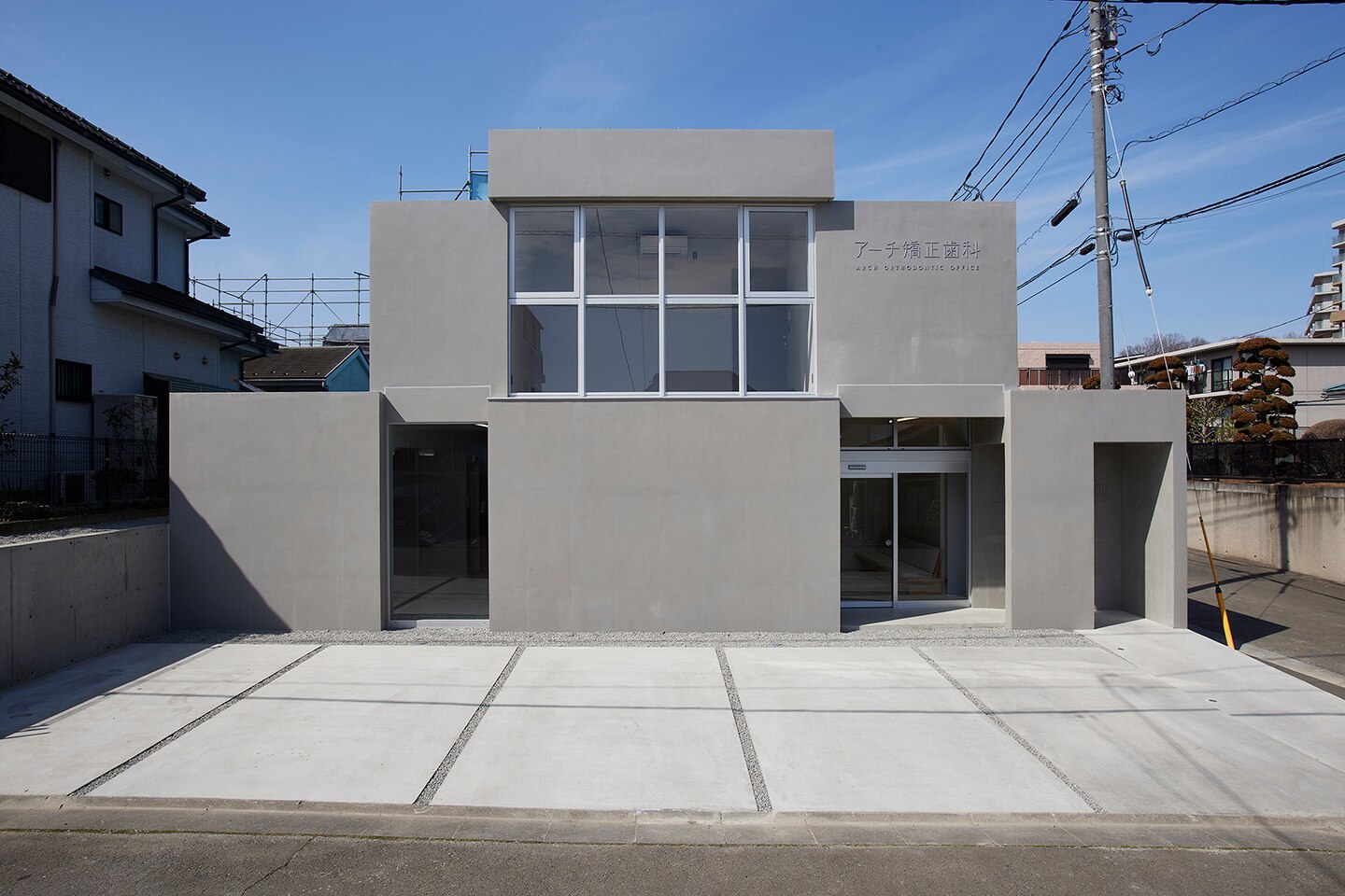 Arch Orthodontic Office is a dental clinic located in a quiet residential area of Hachioji City, near Tokyo. The project, conceived by architect Kunihiko Matsuba, includes a two-story building featuring overlapping concrete blocks and a parking lot for five cars.
