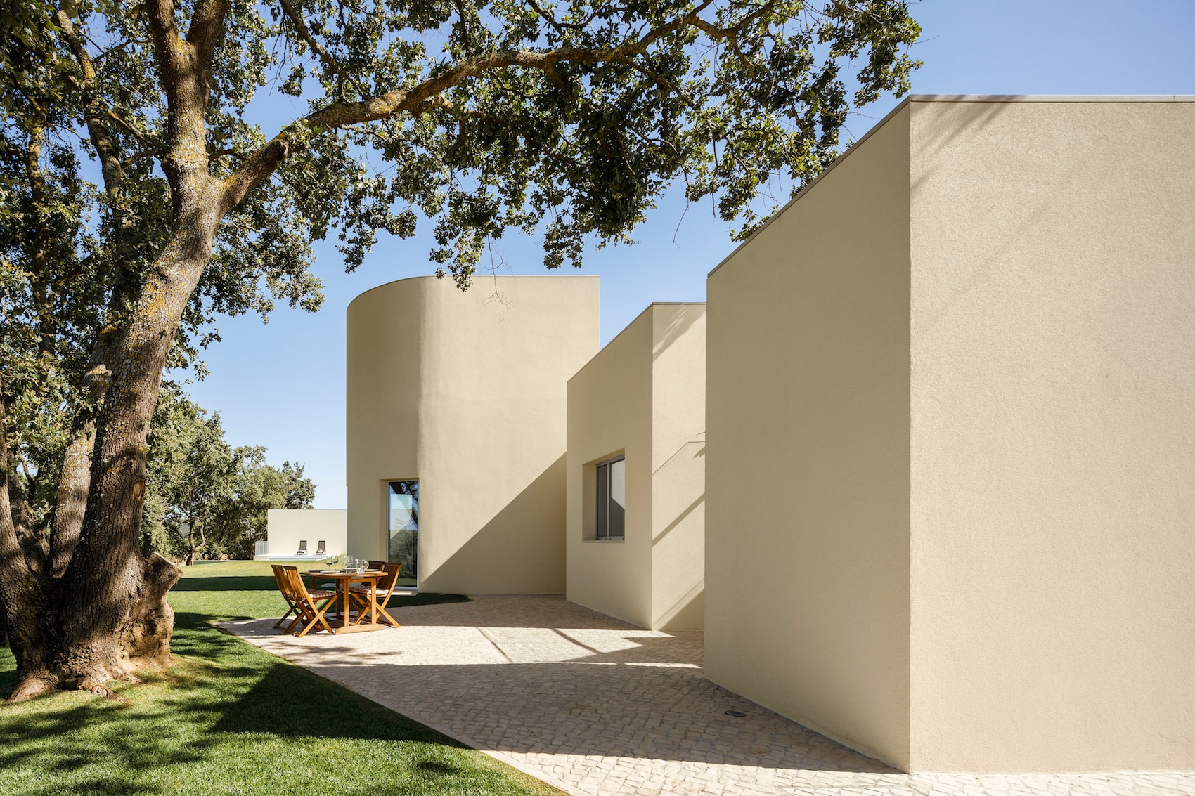 With a view of the Portuguese countryside, dp arquitectos design in Santarém – in the central region of Ribatejo – a single-family villa defined by simple volumes, decomposed and juxtaposed in order to respect and preserve the existing trees, which give important shadows to the immaculate elevations of the project, also thanks to the strong sun of the country.