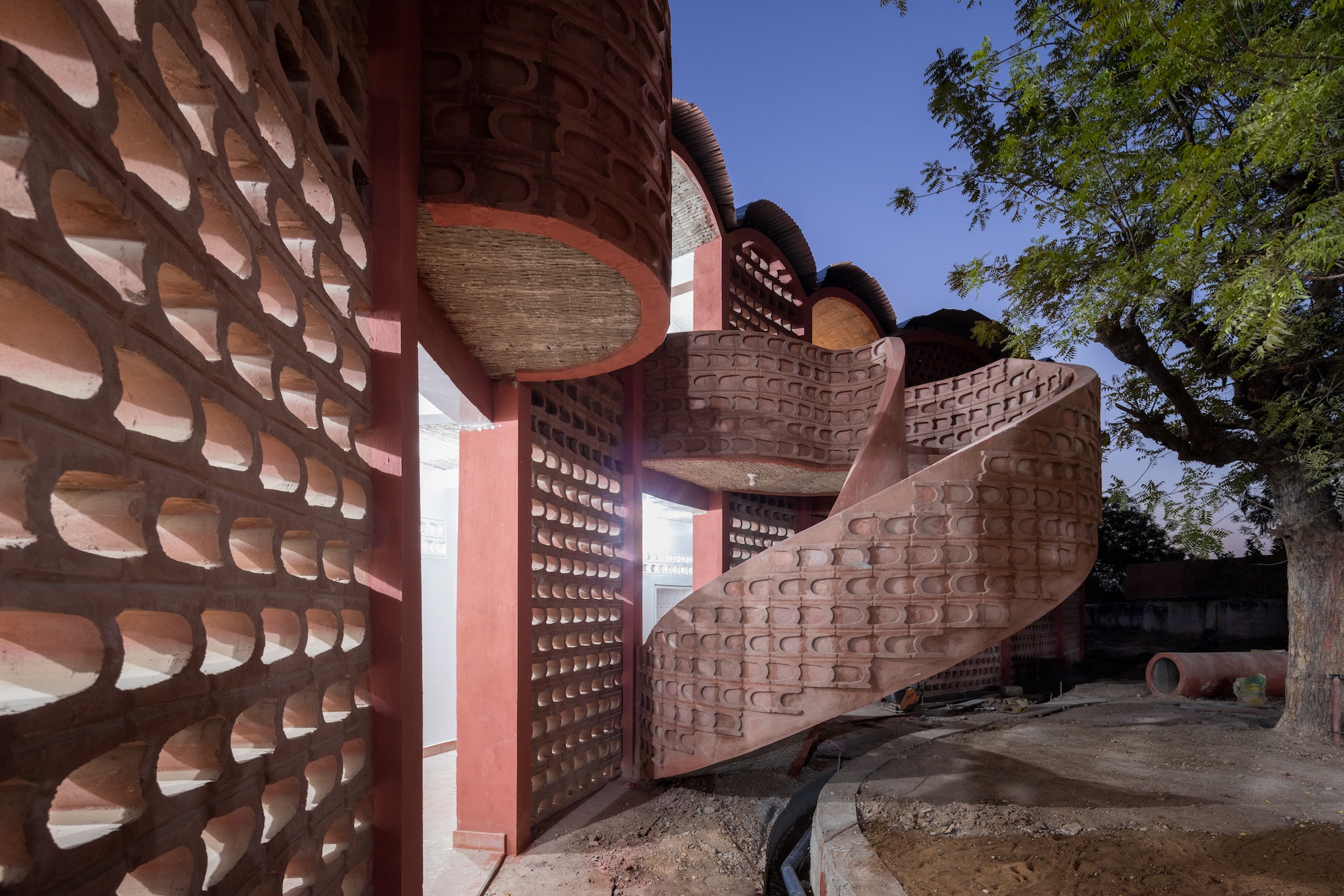 The architecture addresses the challenges posed by the extreme local weather extremes with several passive climate design innovations. The reduced section of only seven meters is the result of a reflection on the passive ventilation of the rooms, which is further filtered and cooled by the implementation of a facade device inspired by the traditional mashrabiya of Islamic architecture: a narrow grid of windows, loggias and balconies. The grid-like pattern of red bricks offers the advantage of blocking the sun and facilitating air circulation. A second roof covers the main roof, repelling most of the direct sunlight.