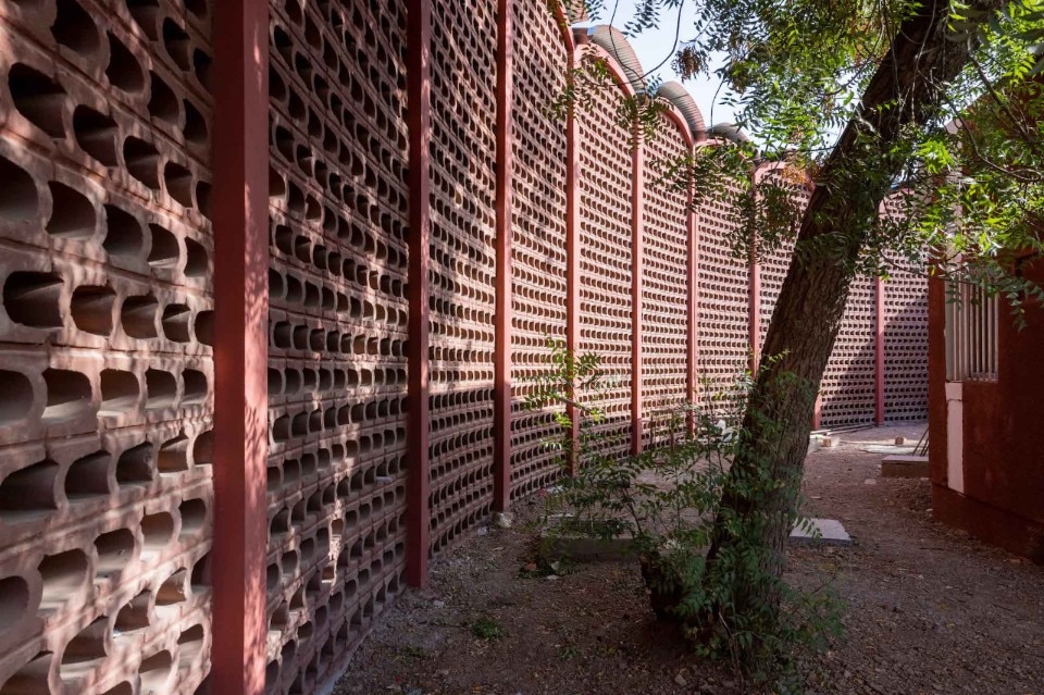 The architecture addresses the challenges posed by the extreme local weather extremes with several passive climate design innovations. The reduced section of only seven meters is the result of a reflection on the passive ventilation of the rooms, which is further filtered and cooled by the implementation of a facade device inspired by the traditional mashrabiya of Islamic architecture: a narrow grid of windows, loggias and balconies. The grid-like pattern of red bricks offers the advantage of blocking the sun and facilitating air circulation. A second roof covers the main roof, repelling most of the direct sunlight.