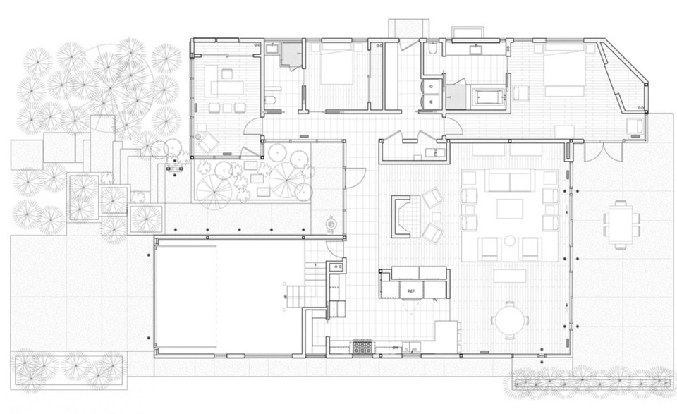 The most complex design challenge faced by the US firm was to rethink the existing fireplace, which could not be moved due to California regulations. It became a free-standing sculptural element, reminiscent of those designed by master architect Frank Lloyd Wright, around which the entire living area was organised.