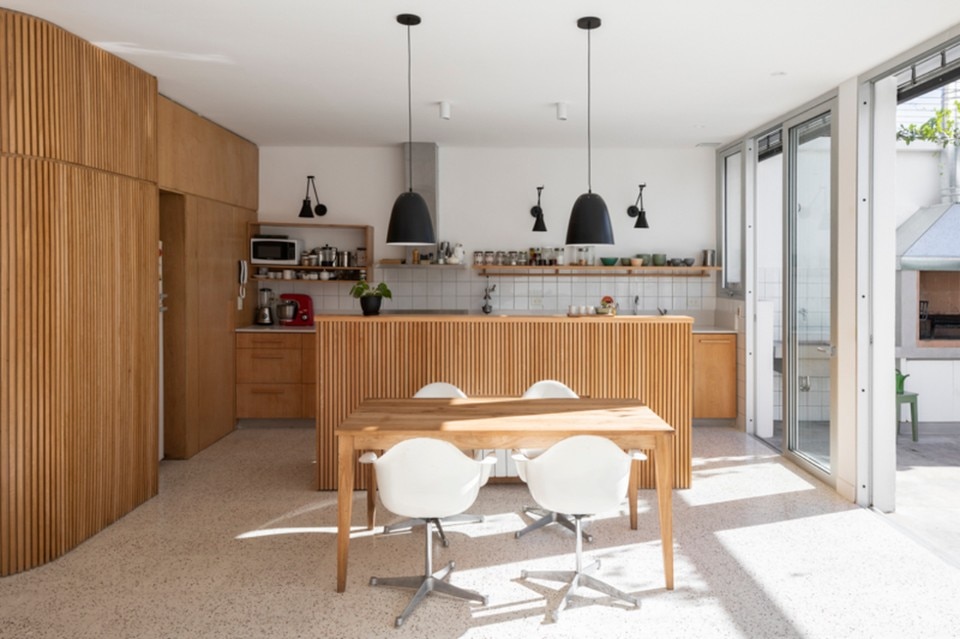 In the interiors, light-coloured terrazzo floors, vanilla-coloured tiles, boiserie and wooden surfaces combine with bright light and a constant relationship with the outdoor spaces, making the two houses cosy nests.