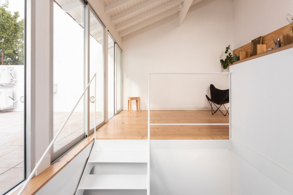 Casa Jardín, also on two levels, with the living area on the ground floor and the sleeping area on the first floor, has its communal areas facing both the bright entrance gallery and the rear garden, from which an independent workspace has been created at the back.