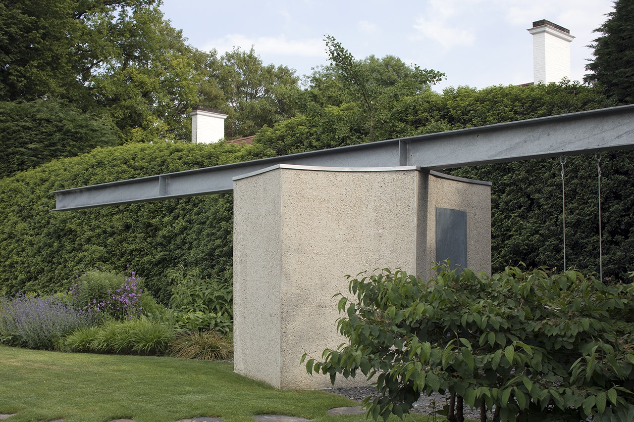 In a private villa in Brussels, the need to create a utility space for the swimming pool prompted Lhoas & Lhoas Architectes to create a small, sculptural, monolithic piece of architecture. It is inspired by prefabricated plaster cabins, and is made of cement, polished on one side and rough on the other. The volume has six sides and is characterised by concave walls, to make the architectural object less massive from the outside. The sculpture continually redraws itself according to the rays of the sun, thanks to its own shadows and the shadows cast. At the top of the block we find a skylight, which is the only opening that allows natural light to enter the interior, and a beam, which rests gently and is used only as a compositional event, losing its structural function. The metal element is clearly disproportionate to its function, which is to support a swing.