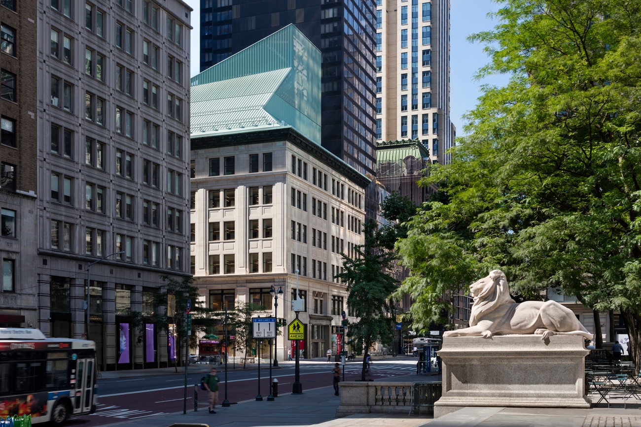 A journey that begins at street level on Fifth Avenue, passes through the Long Room – a void that cuts through the building 26 feet high to Hayal Pozanti's vibrant ceiling artwork – and culminates on the new public rooftop where everibody is welcome. “When I first visited the rooftop on the former Mid-Manhattan library I saw a space with enormous potential, at the time was unused and full of mechanical installations. Here we are in the heart of Midtown with this great space and beautiful views to the Stephen A. Schwarzman Building and Bryant Park – we had to give this space to the people”. The most unique feature of the project lies in its roof. The angular pitches and copper-coloured patinated aluminium surface of this new addition slope down to cover the mechanical equipment, reaching 56m above street level. As the designers say, it is inspired by the copper-clad attic roofs of Manhattan's Beaux Art and also winks to both the tapered spires of New York art deco skyscrapers and the faceted facades of its newer towers.