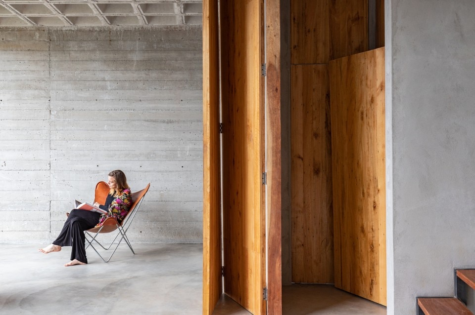 The cement core is added with a 15 square metre volume facing the terraces on the upper floor and an independent 20 square metre module for guests. Both additions are clad in black corten steel with wooden frames.