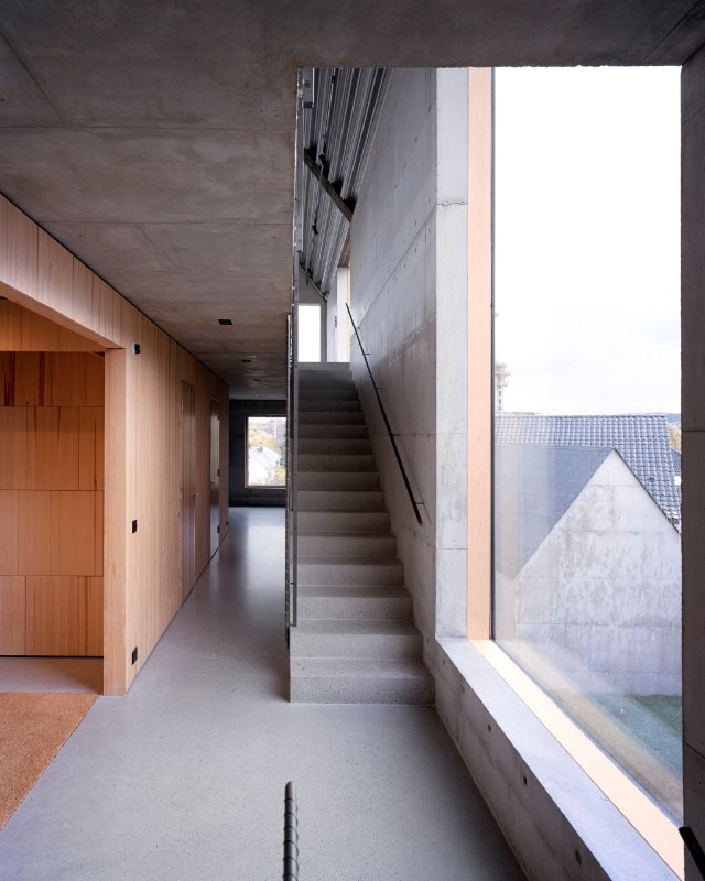 The strict, exposed concrete volume houses three levels: the top floor, at the highest elevation of the land to the west, accommodates daily activities in the living area and the kitchen with a loft for a study corner; the second floor, where the main access is located, includes three bedrooms and a living room; the first level includes the service and accessory spaces. To maximise the capture of northern light, large glazed openings interrupt the solid concrete envelope and project the view towards the external landscape.