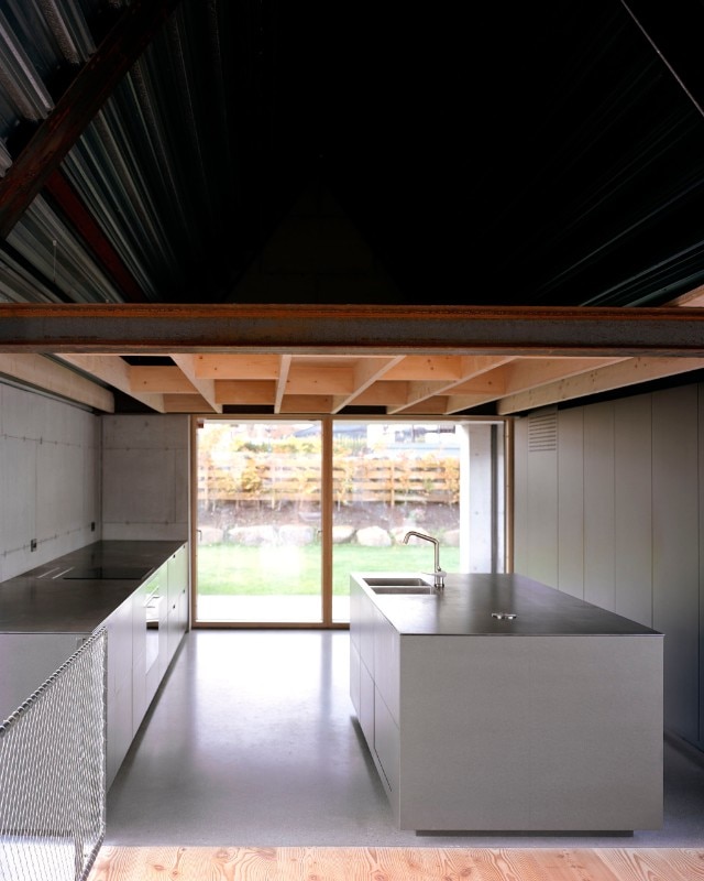 Inside, the exterior sobriety is not detracted from by the aura of measured composure which allows no unnecessary showiness and is found in the simple, straightforward materials and natural finishes: from the metal in the soffit of the roof and in the furnishings, to the exposed cement in the walls, to the polished cement and wooden floors and the interior partitions made of panels with matching pinewood doors