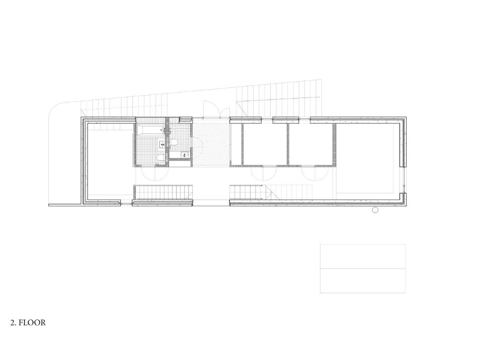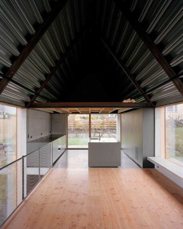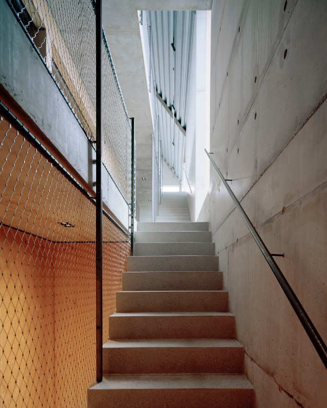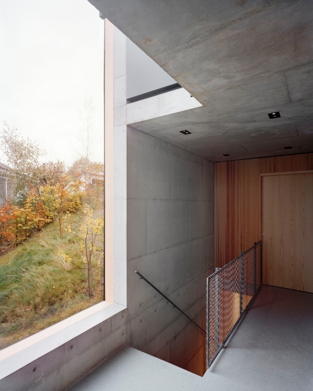 The building's rigorous design sums up the desire to come to terms with the dominant nature of the place, characterised by a harsh maritime climate with abundant rainfall: hence, the almost archetypal silhouette of a shelter protected by steeply sloping roofs, set into the plot of land which slopes steeply eastwards, dropping about 7 metres towards the city.