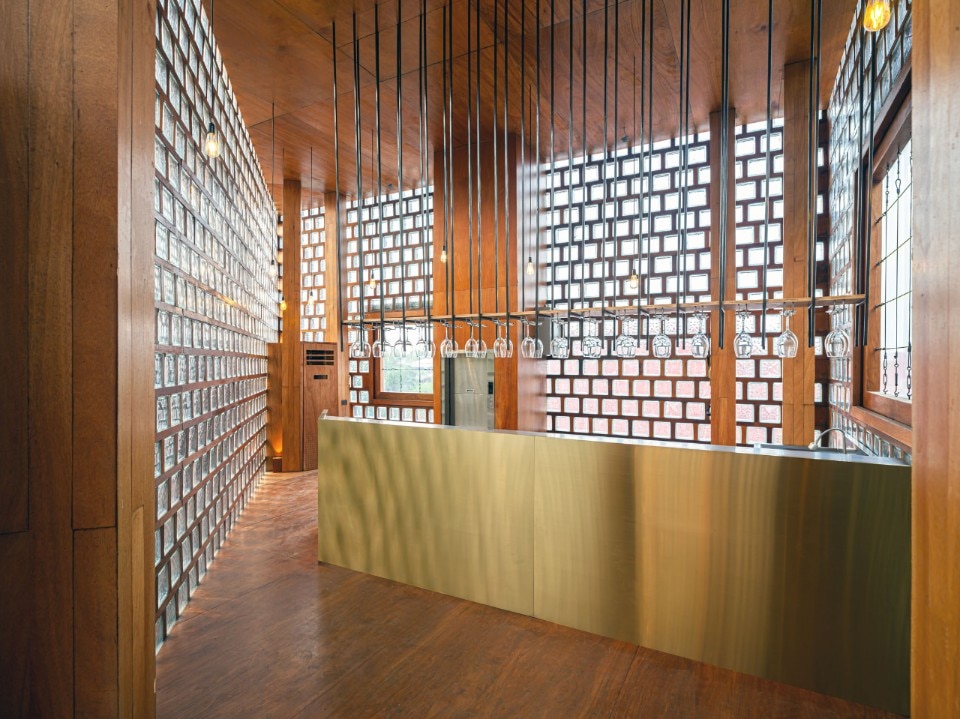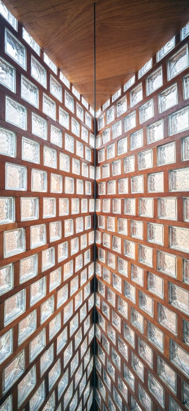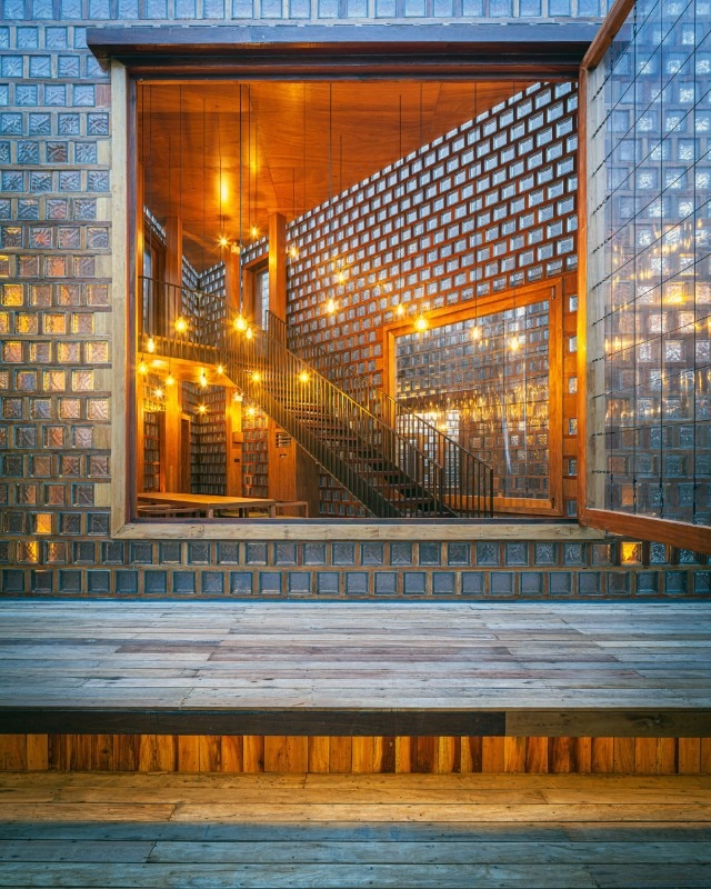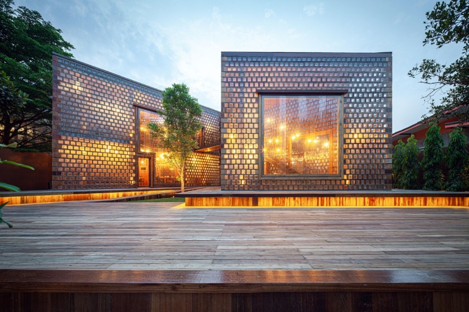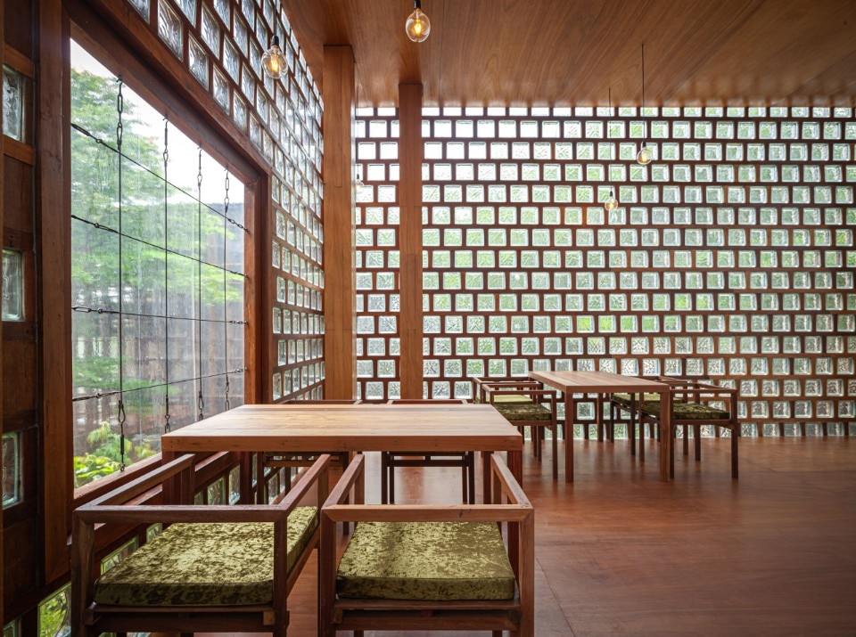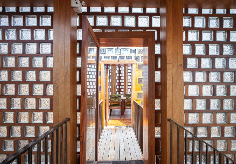 Entirely recycled materials take on a new aura, becoming the protagonists of the composition: the exterior facades, supported by a steel structure, are made of unsold glass blocks, an undervalued material in the country because it is linked to functional uses, and dry-framed in rubberwood frames. PVC was chosen for the windows - reinforced to withstand the force of the wind - a light material and less expensive than the noblest glass sheets, while truck hinges were used for the door and window hinges, adapted to support the weight of the large openings.