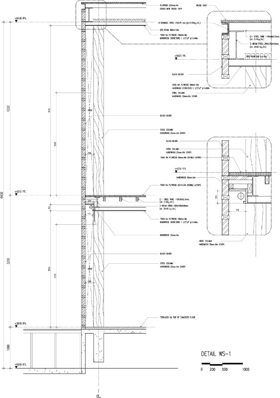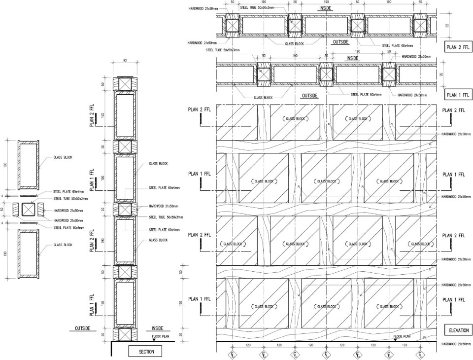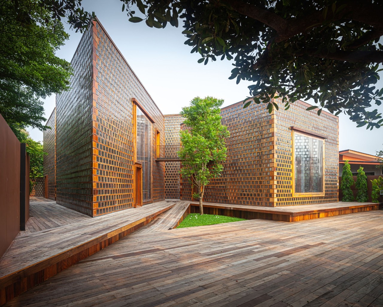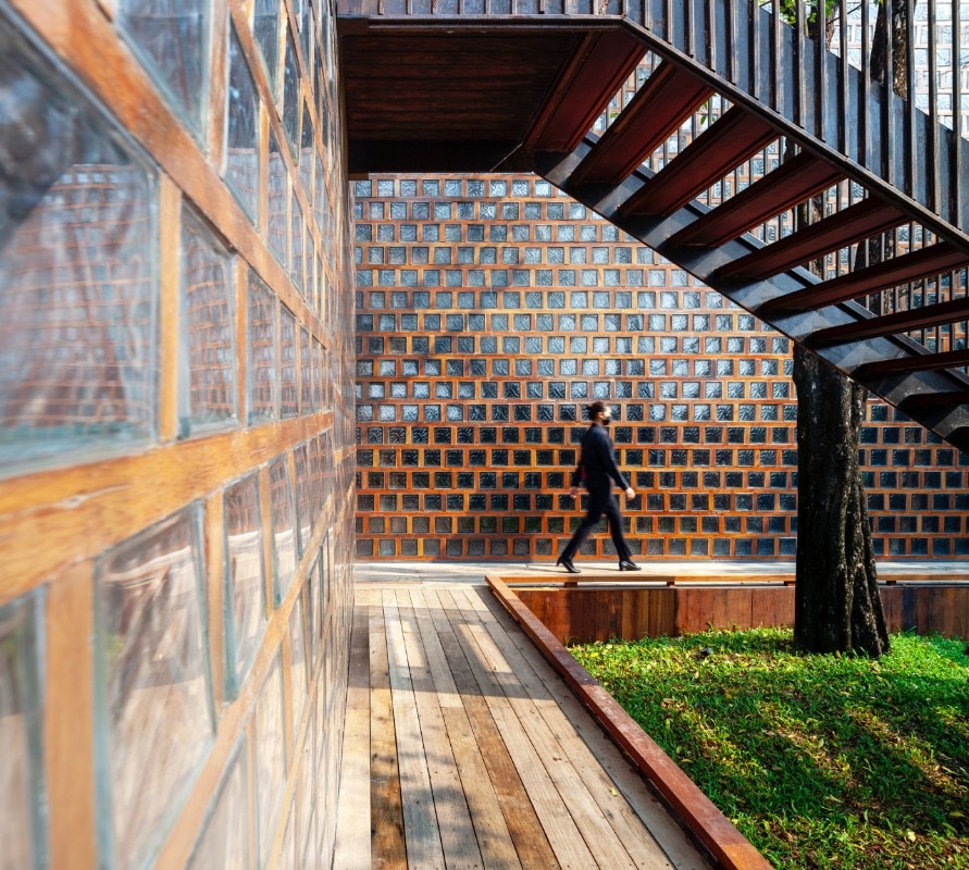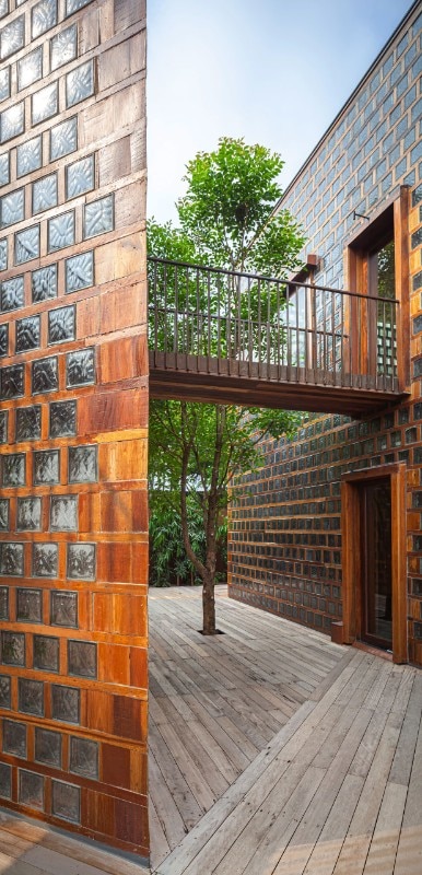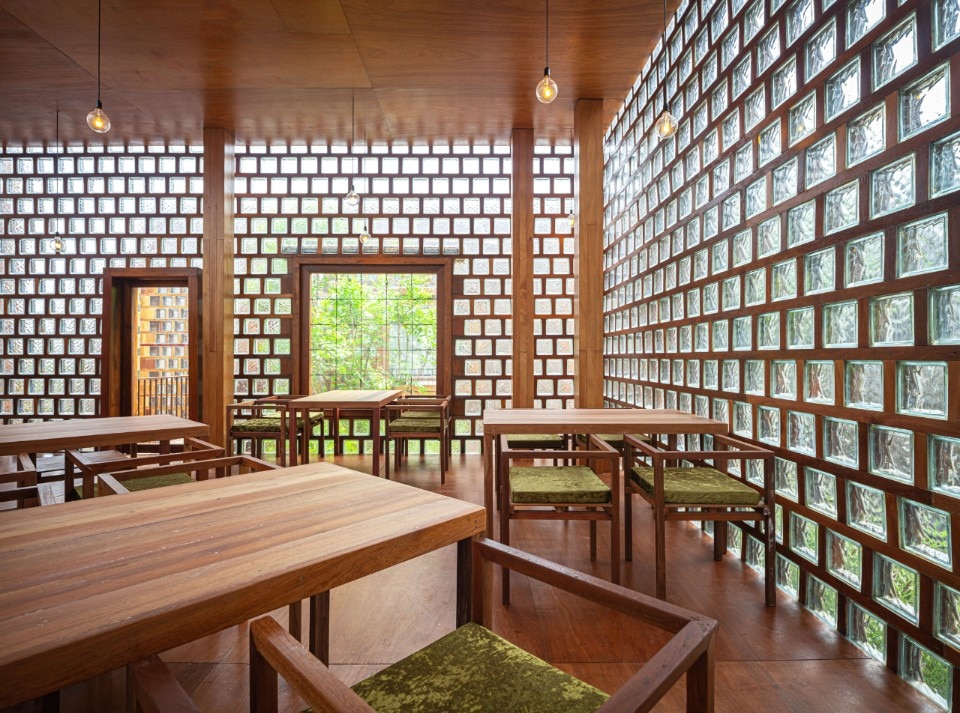 Entirely recycled materials take on a new aura, becoming the protagonists of the composition: the exterior facades, supported by a steel structure, are made of unsold glass blocks, an undervalued material in the country because it is linked to functional uses, and dry-framed in rubberwood frames. PVC was chosen for the windows - reinforced to withstand the force of the wind - a light material and less expensive than the noblest glass sheets, while truck hinges were used for the door and window hinges, adapted to support the weight of the large openings.