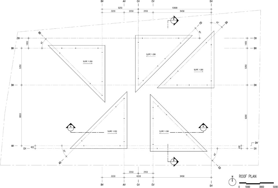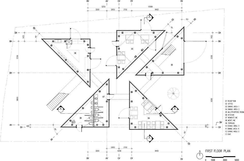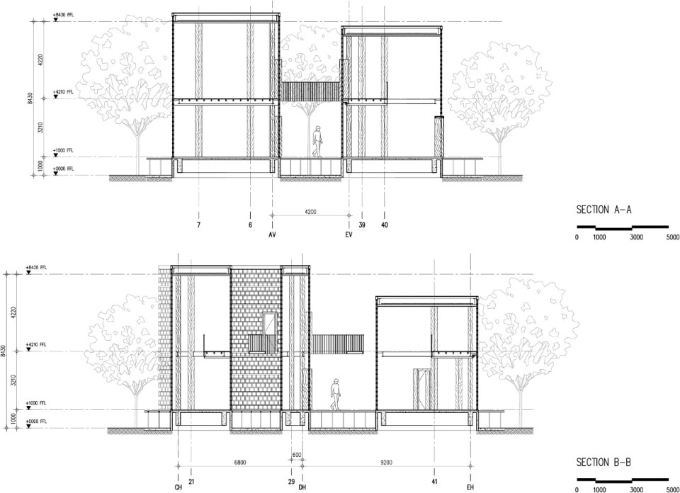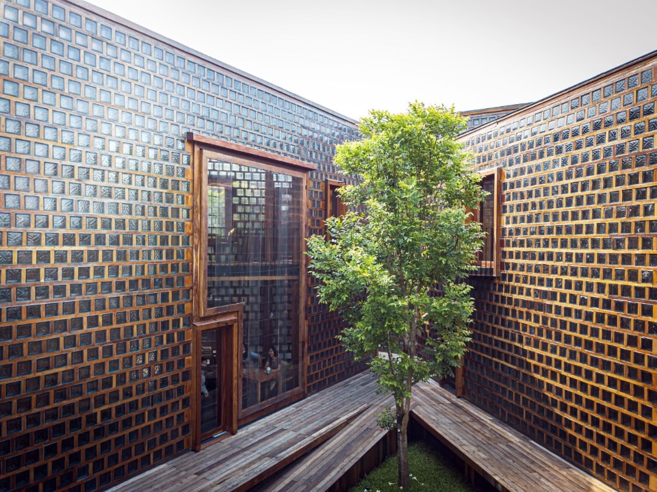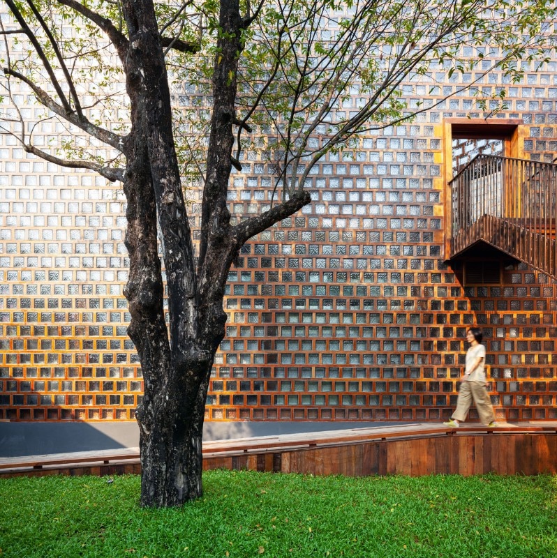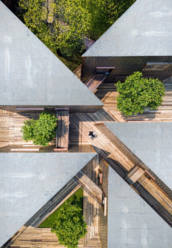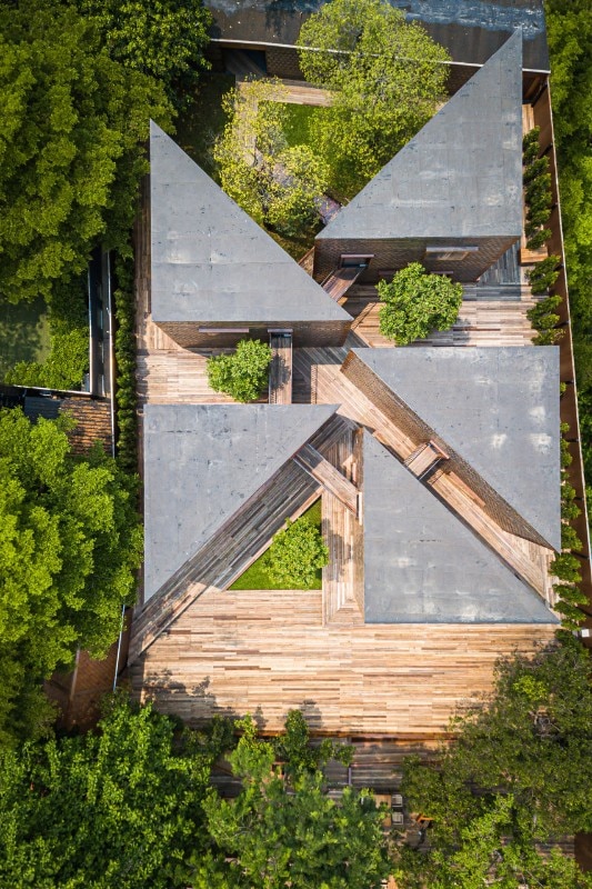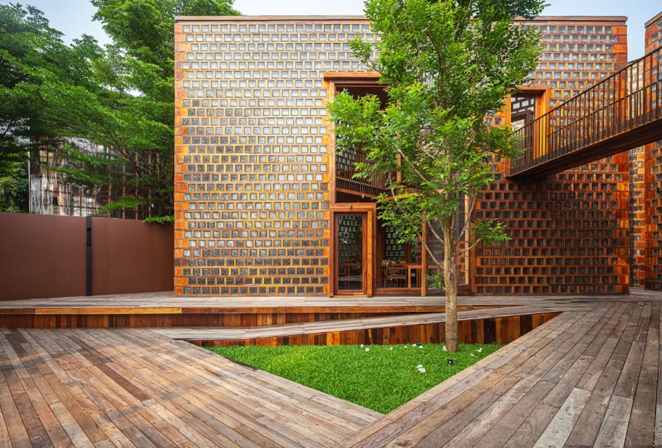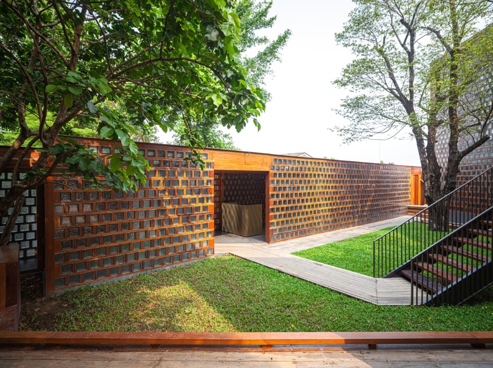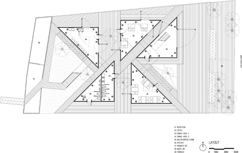 Here, Bangkok Project Studio has designed a restaurant which is an intense homage to the cultural heritage of the place and its people. The project is made up of five two-storey buildings of identical size, in the form of rectangular triangles connected by elevated paths and arranged so as to delimit internal green courtyards. Each building houses different functions related to catering and is named after one of the old ladies who live and cook in the village.