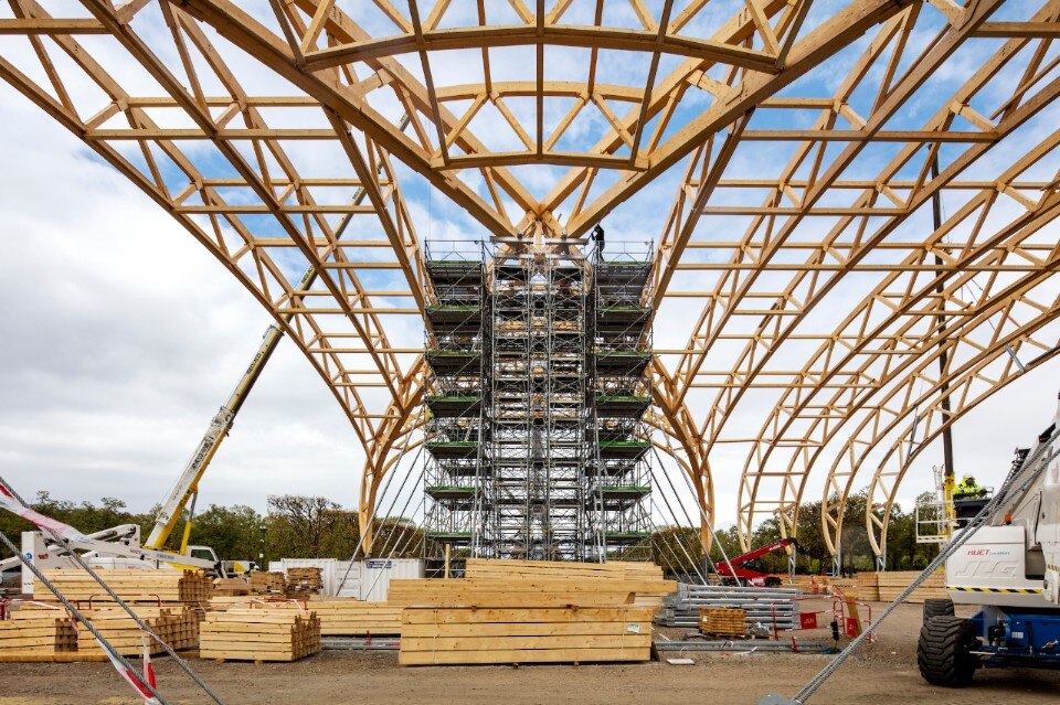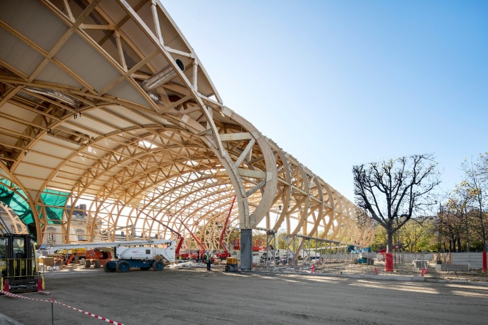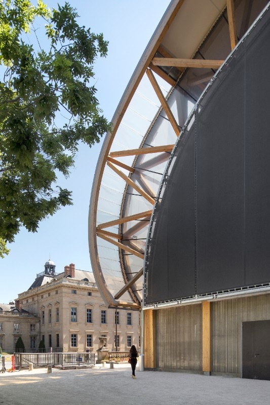Structurally, the pavilion is supported by 44 prefabricated wooden arches, and a double skin made of a special transparent mineral-based polymer, completely recyclable. An example of post-pandemic architecture, characterized by large spaces and generous openings, the architecture will also be part of the organization of the Olympic and Paralympic Games scheduled for 2024, without the hassle caused by the periods of assembly and disassembly of the stands that repeatedly affect local residents.