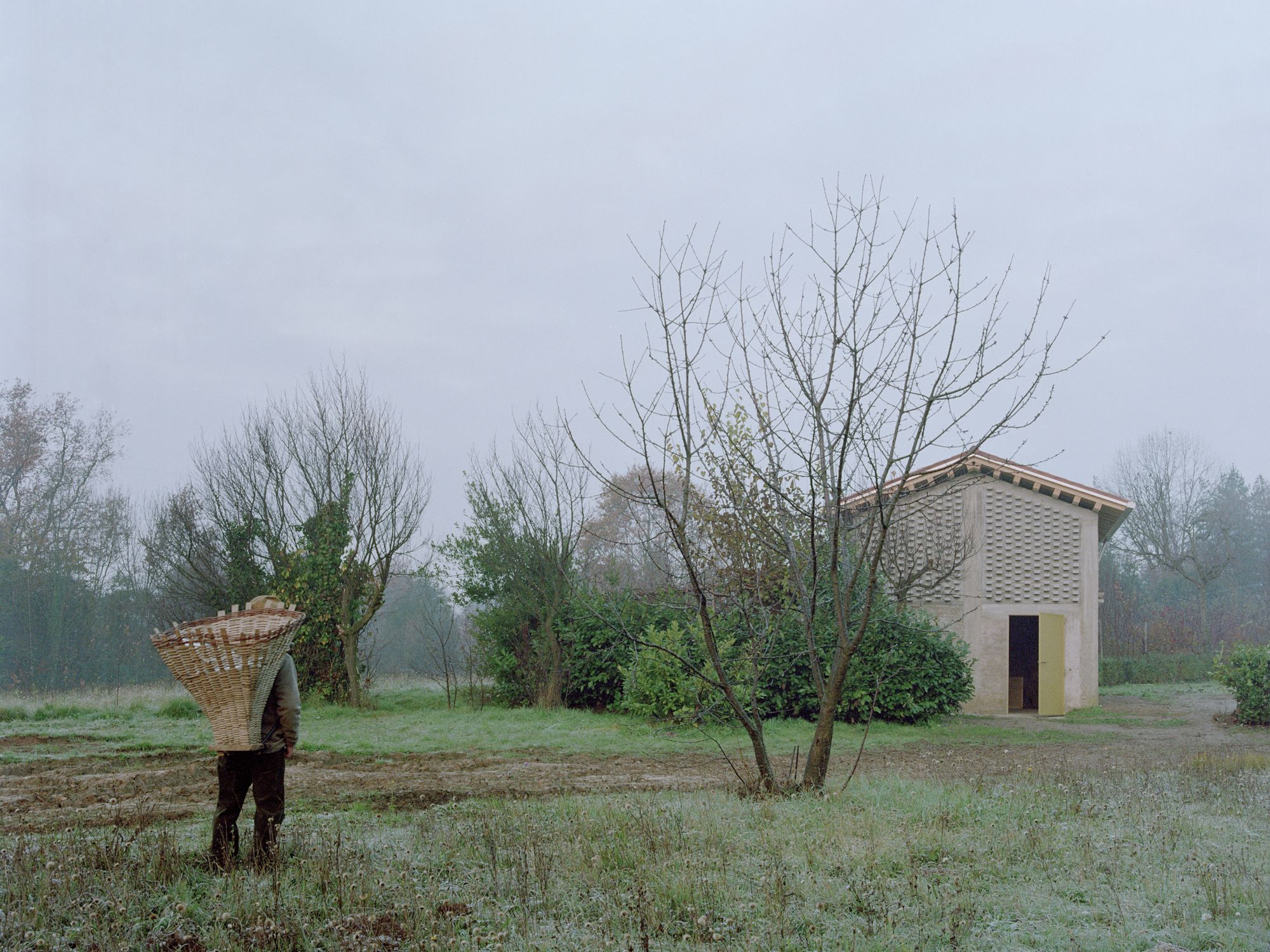 The atmosphere looks like what Luigi Ghirri used to capture in the Emilian countryside in the 1970s, but we are in the upper Brianza region, at the foot of the Montevecchia hills. In this context, the two brothers Francesco and Paolo Manzoni, founders of the a25architetti studio in 2018, are involved in the renovation and enhancement of the Rifugio del Gelso, a small agricultural building serving the surrounding land. At the beginning of the 20th century, mulberry trees, along with vines and silk production, were the crops that characterised the hilly landscape, but today the land is worked for different uses such as hay meadows, pasture and corn crops. There are very few mulberry trees left, and one of them is right in front of the Rifugio.