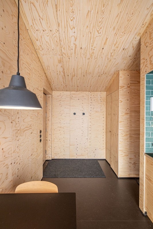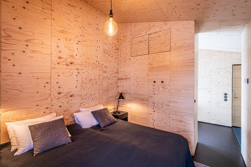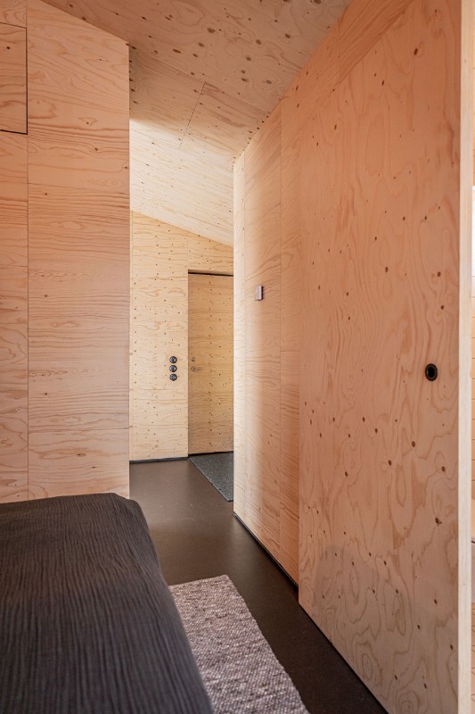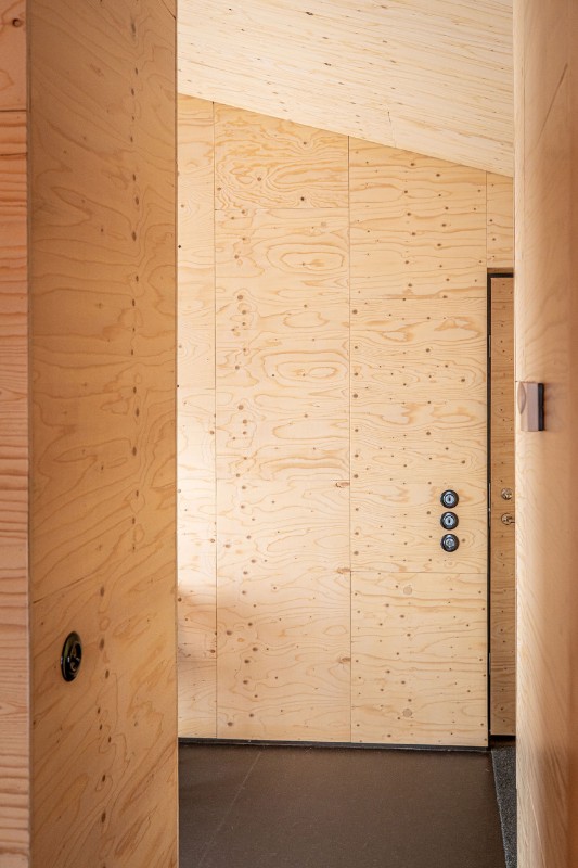 The entire construction is made of wood, a natural material quintessentially. The exteriors are covered with slats of pine wood burnt according to the ancient Japanese technique of Shou sugi ban, which makes the material more resistant to atmospheric and organic agents after it has been carbonized; in contrast with the dark colour of the façades, the interiors are made of light pine wood, giving the rooms more light and warmth.