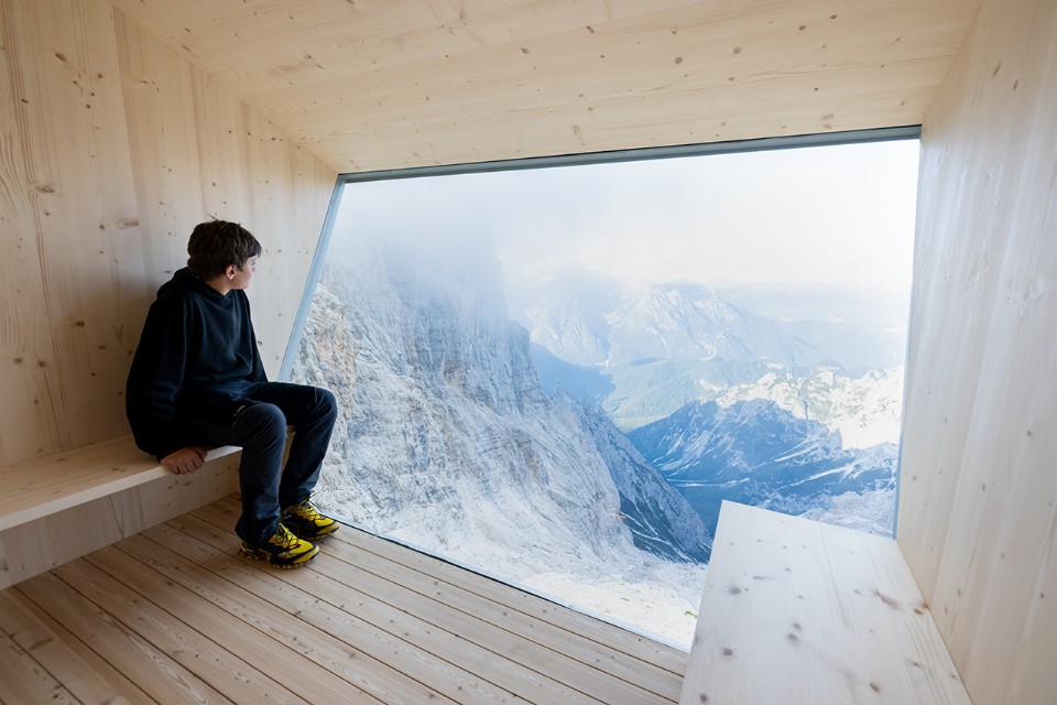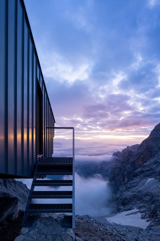 The Fanton bivouac, designed by the Demogo architectural firm, creates a unique connection between man and the environment, making the natural context habitable. On the one hand it protects hikers from wind, snow and cold, and on the other it is designed as a telescope, a device for framing the landscape and observing it.