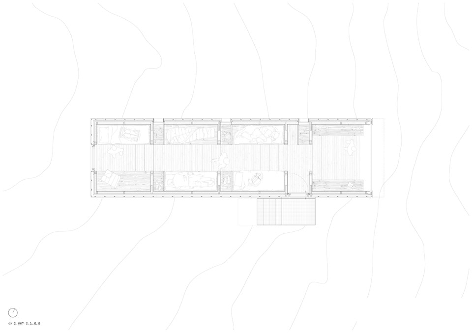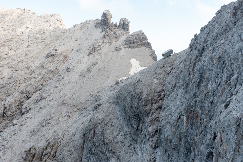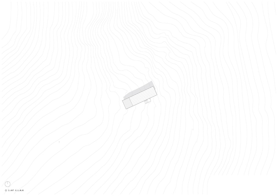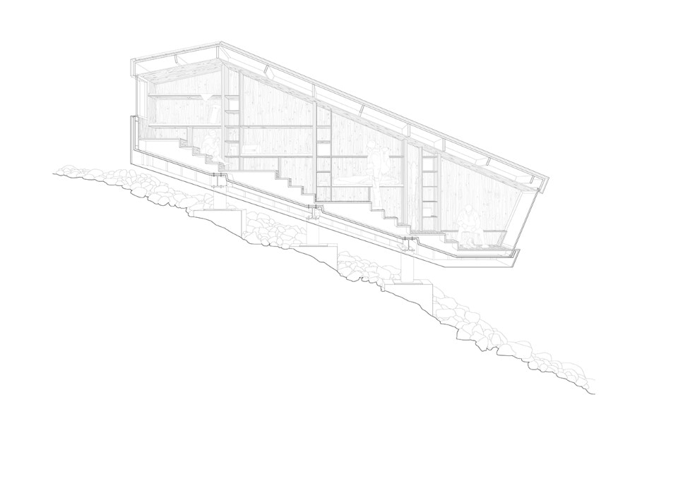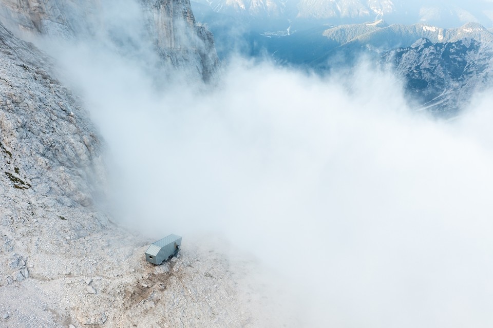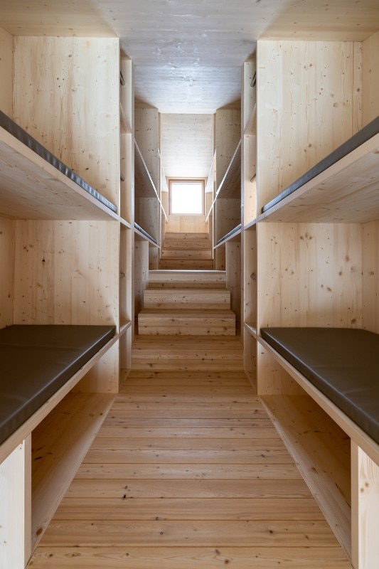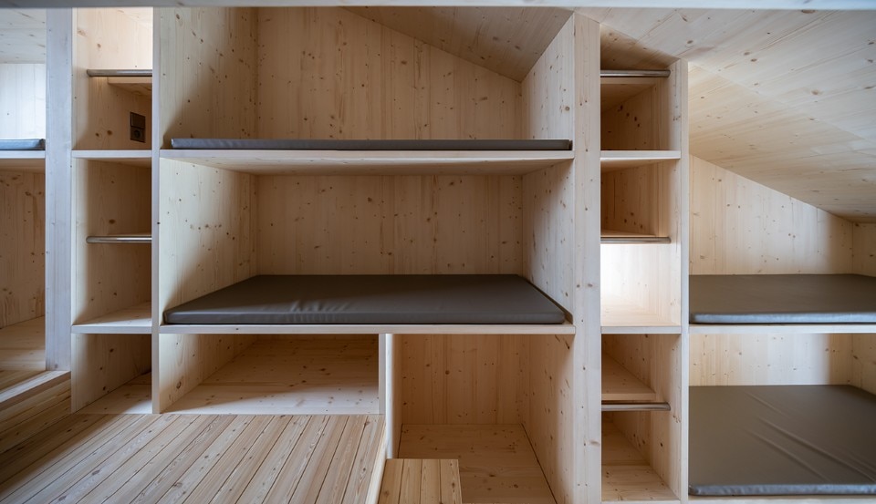 Situated at an altitude of more than 2,600 metres, the hut is a piece of architecture characterised by a strongly sloping profile, which adapts to the orography of the Marmarole, giving a feeling of precariousness from the outside. This form also characterises the interior spaces of the hut, which has a stepped section. If from the outside the project seems at the mercy of the weather and the landscape, inside the raw wood creates an austere, warm, comfortable and safe environment.